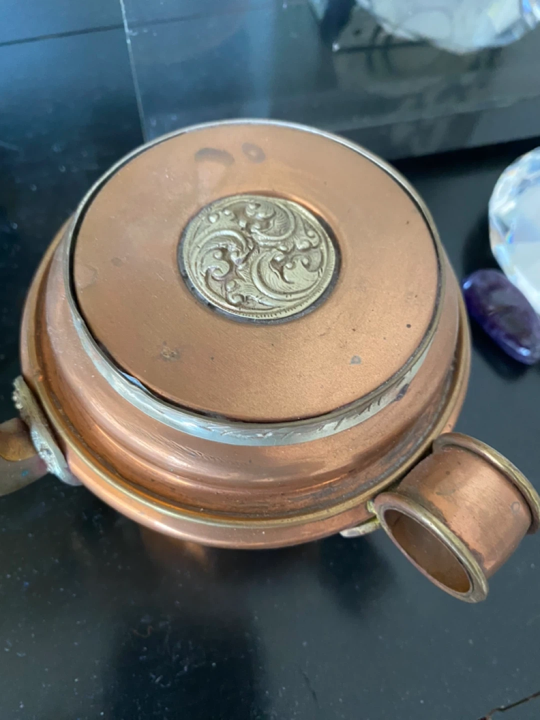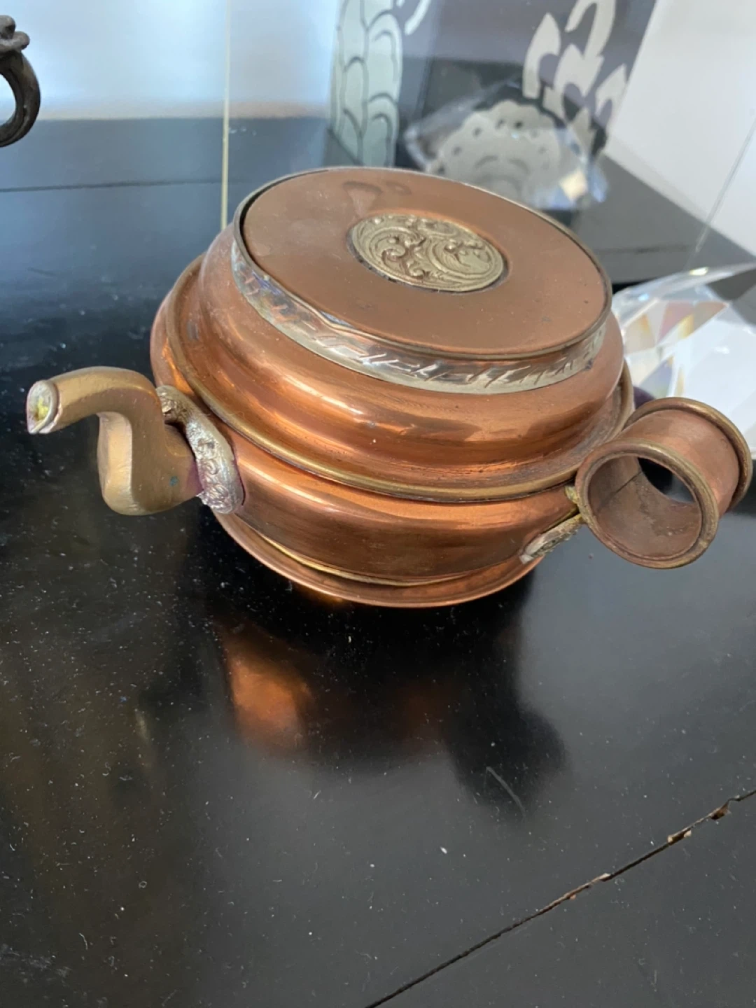 Selling a vintage copper teapot! It has a unique design with silver accents and a charming patina from age. It would be a great addition to any collection or as a decorative piece