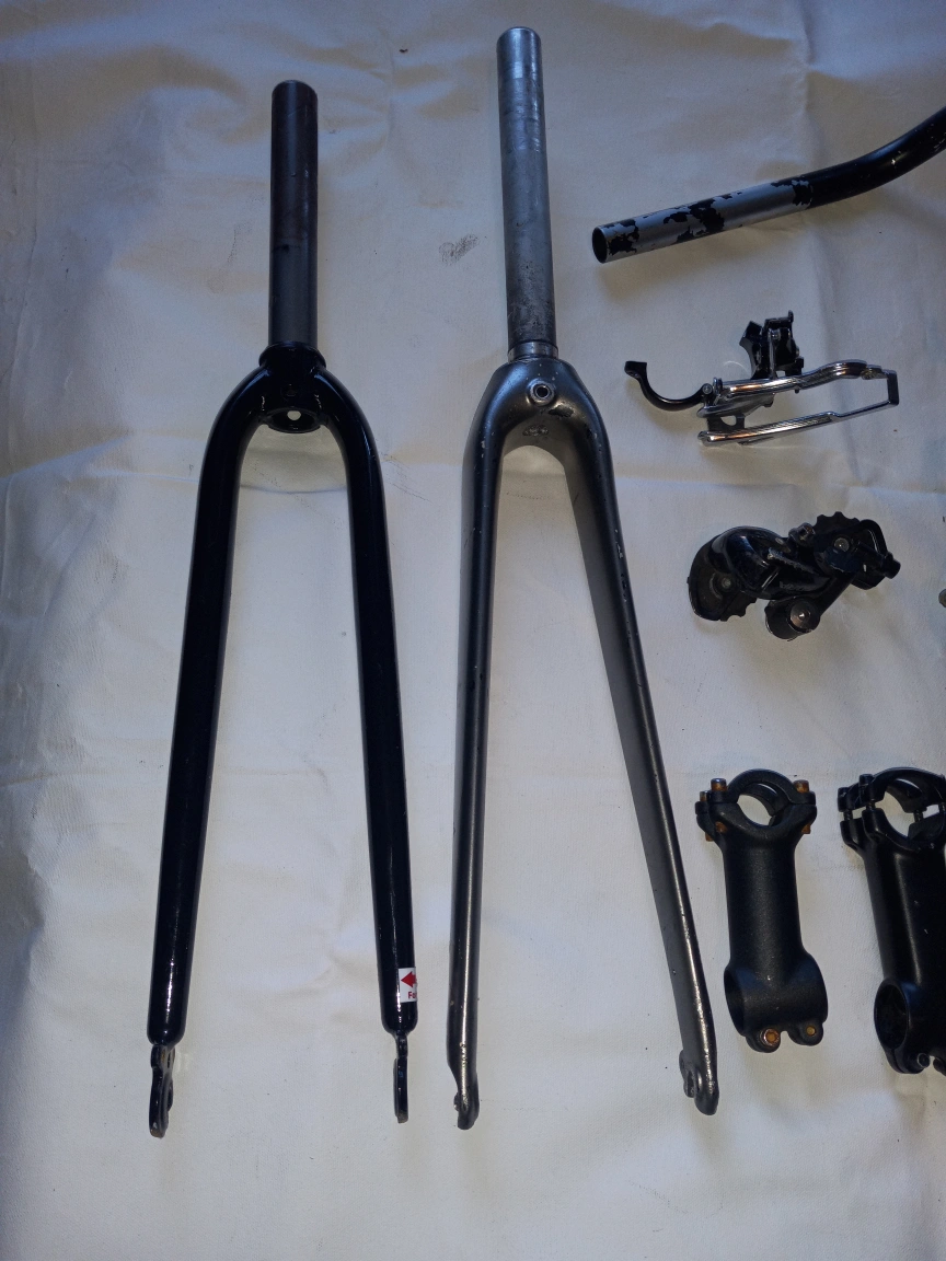 Selling a collection of used bicycle forks and various parts. Good for repairs or custom builds