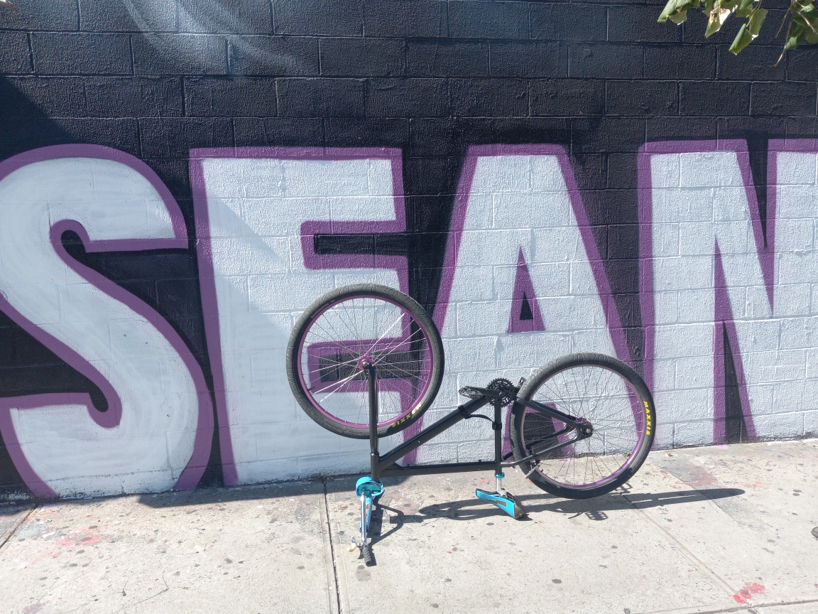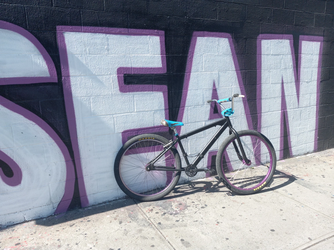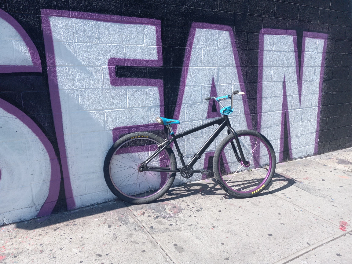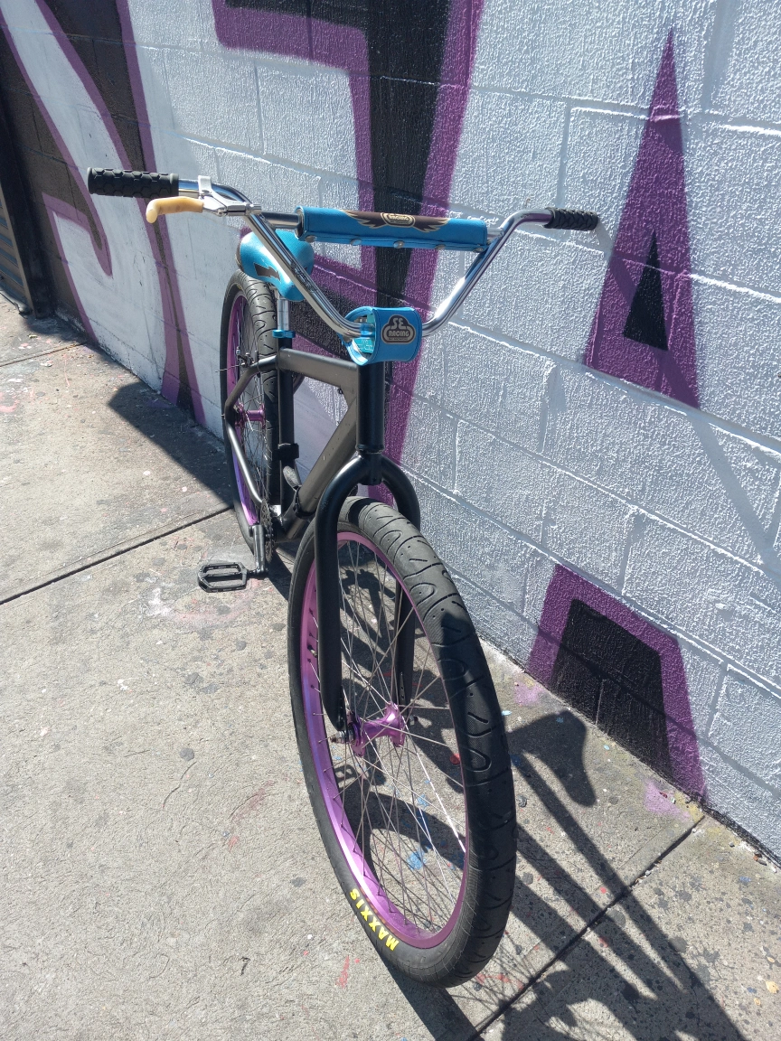 Selling a cool BMX bike featuring a black frame and eye-catching purple rims! It's in good condition and ready for some action. The tires are Maxxis brand. Perfect for anyone looking to upgrade their ride!