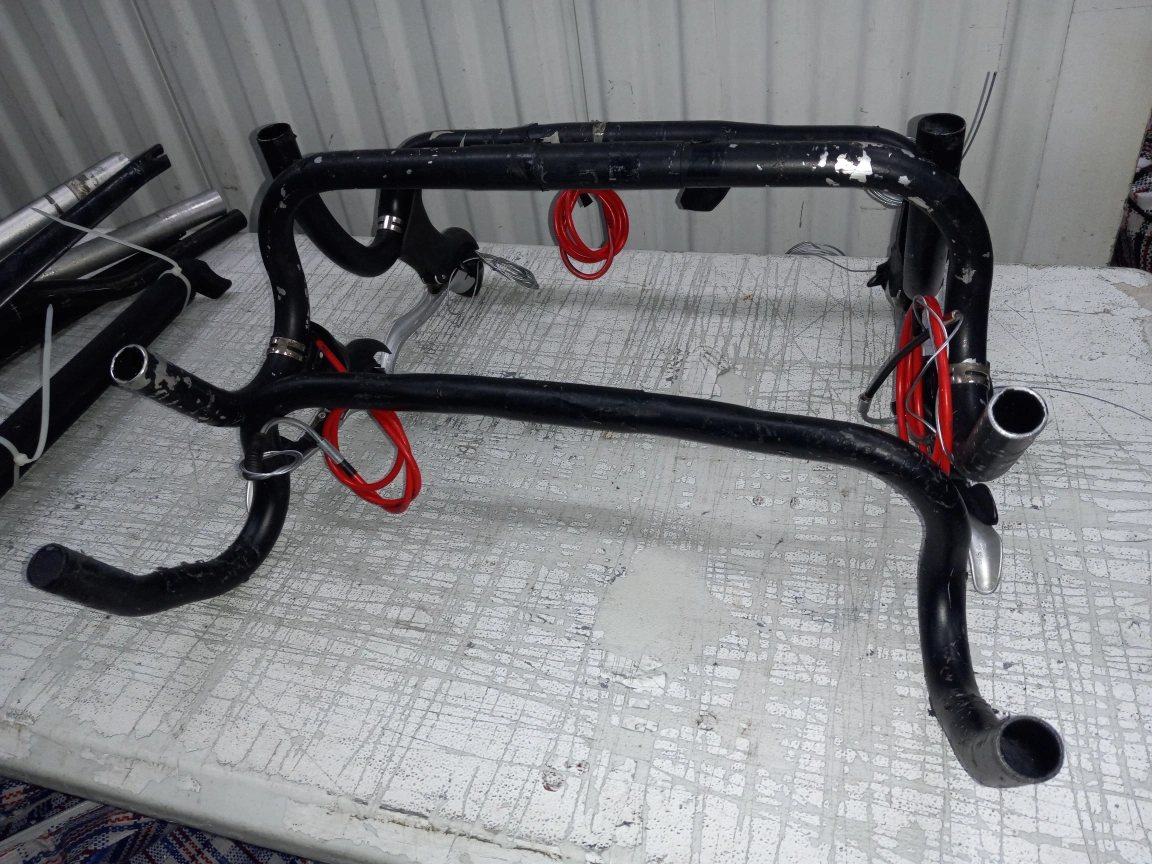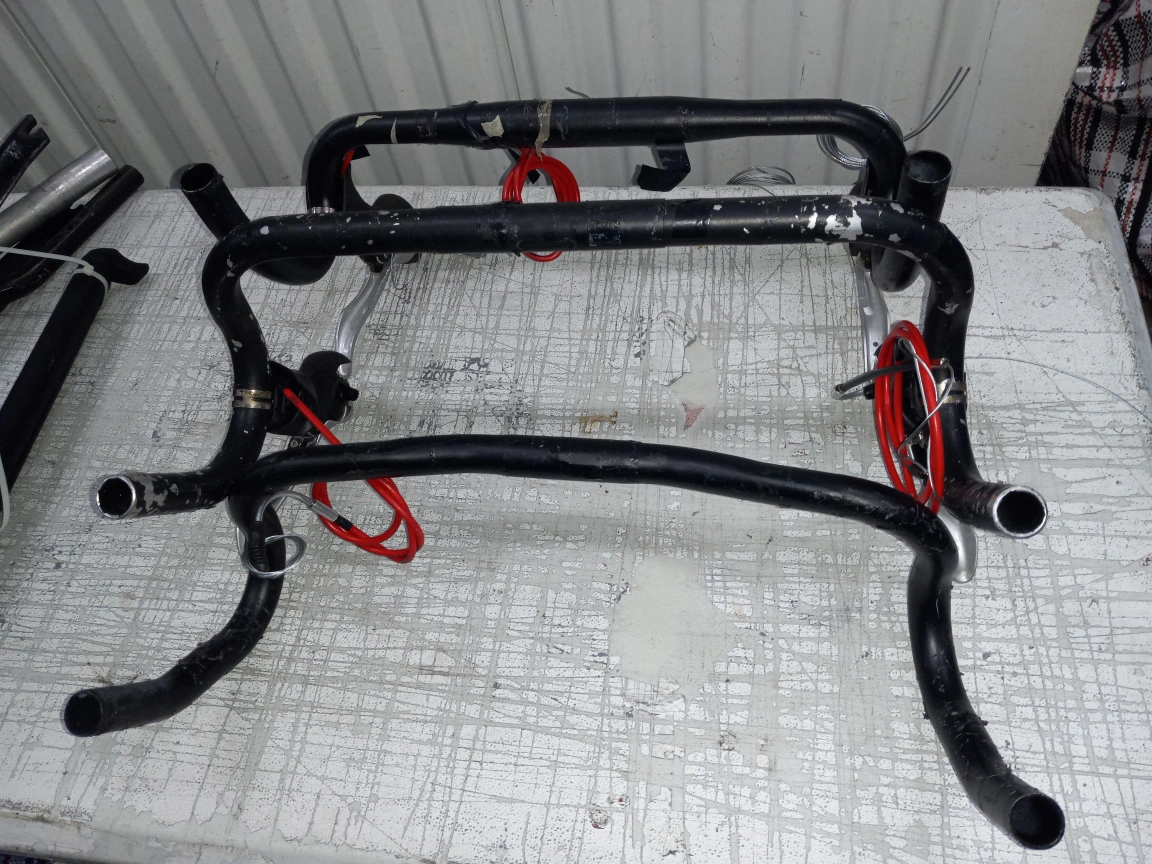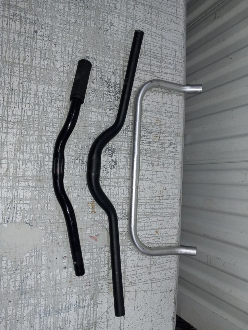 Selling a collection of used bike handlebars. There are several different styles and colors, including black and silver. Good for various bike types!