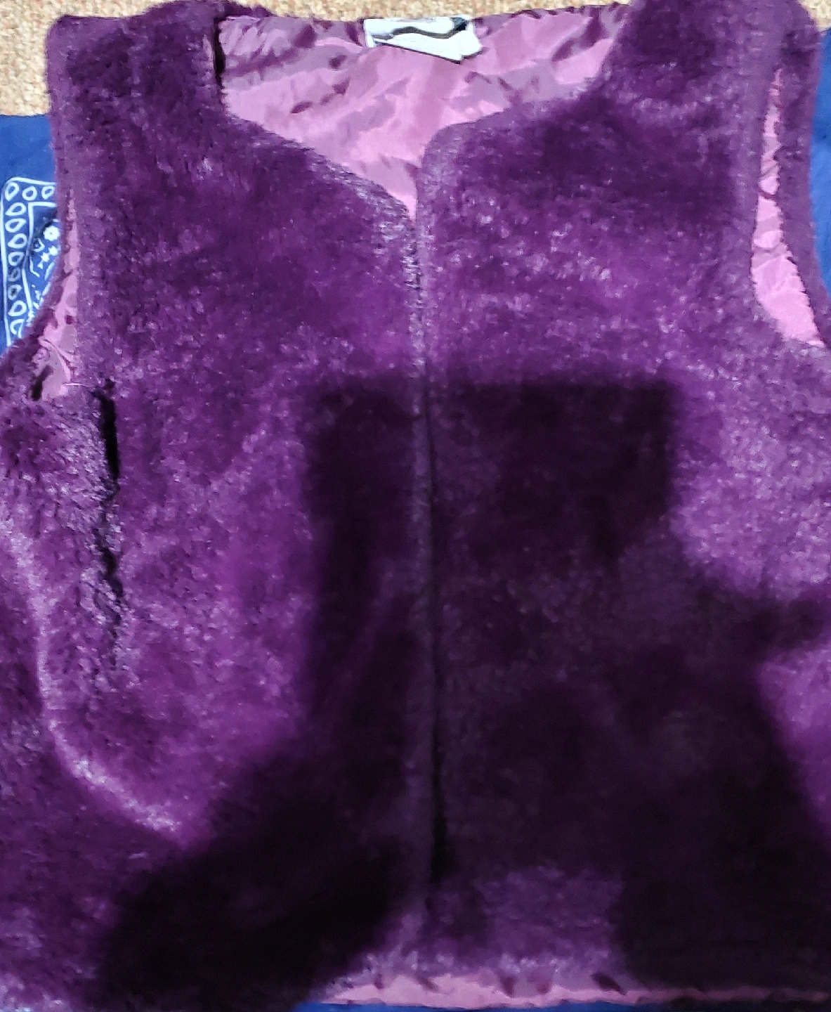 This is a soft and cozy purple faux fur vest. It's perfect for adding a touch of warmth and style to any outfit!