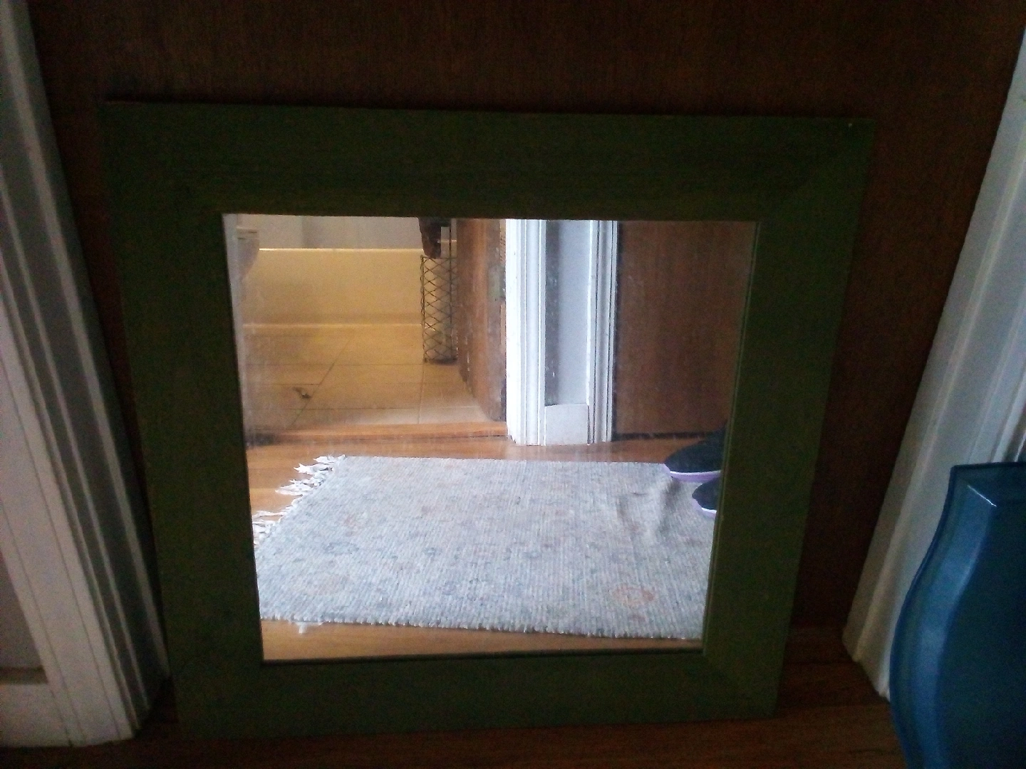 Here's a framed mirror with a green frame. It would be a great addition to any room!