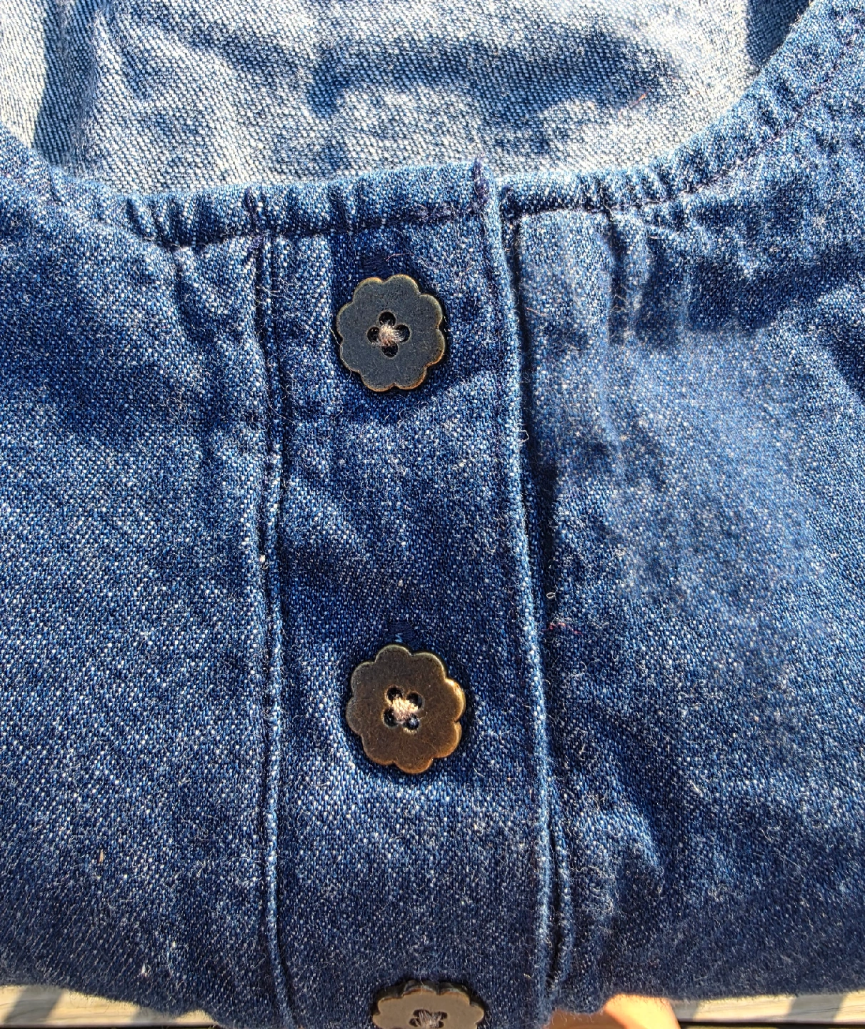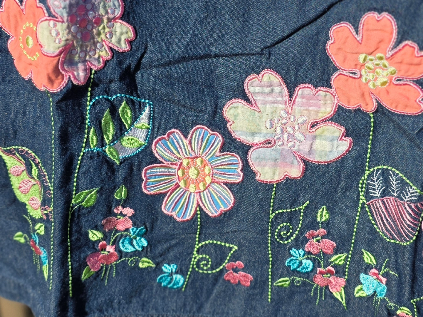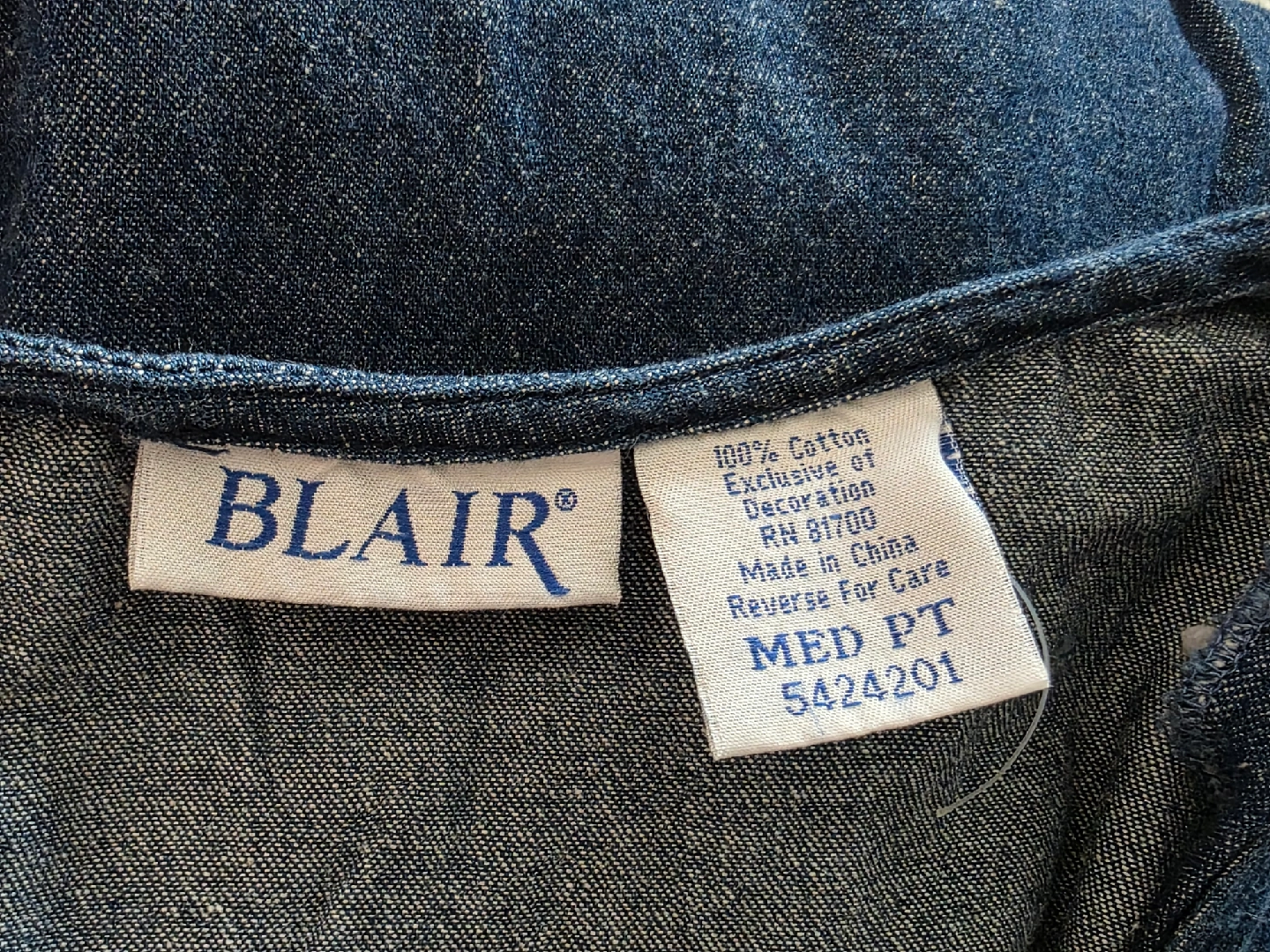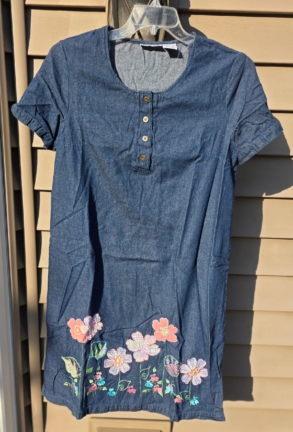 Cute Blair denim dress in a size medium petite! The dress is 100% cotton and features an exclusive decoration. It has short sleeves and a lovely floral design at the bottom
