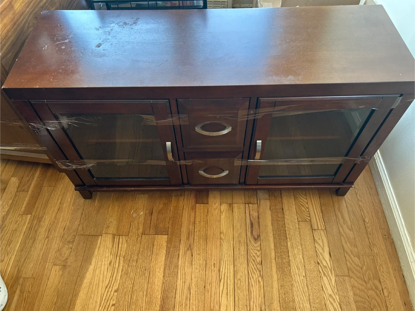 Selling a brown wooden TV stand with glass doors and drawers. It shows some signs of use on the top surface, but is otherwise in good condition. Perfect for adding storage and style to your living room! A good wash and it’s brand new.