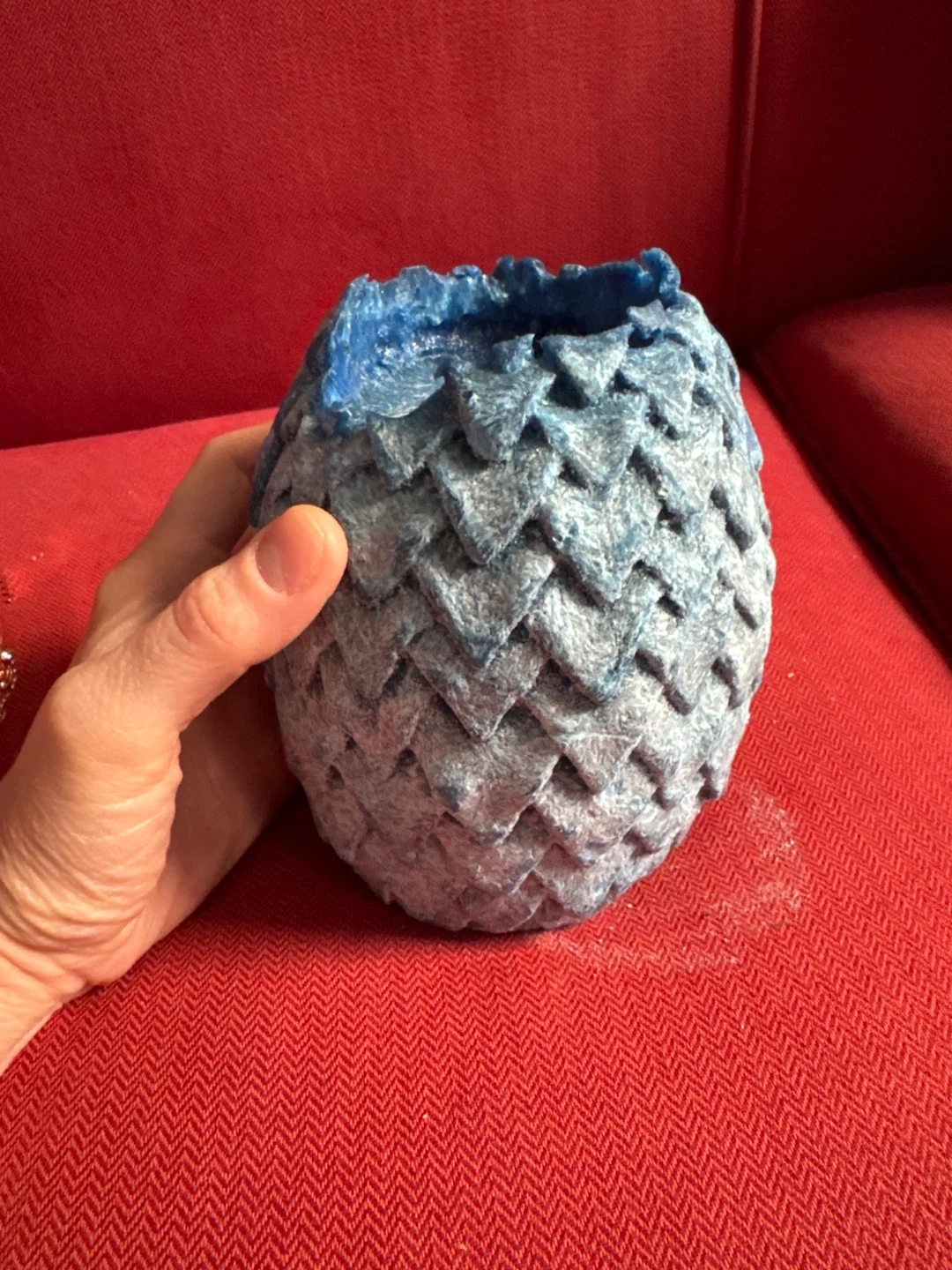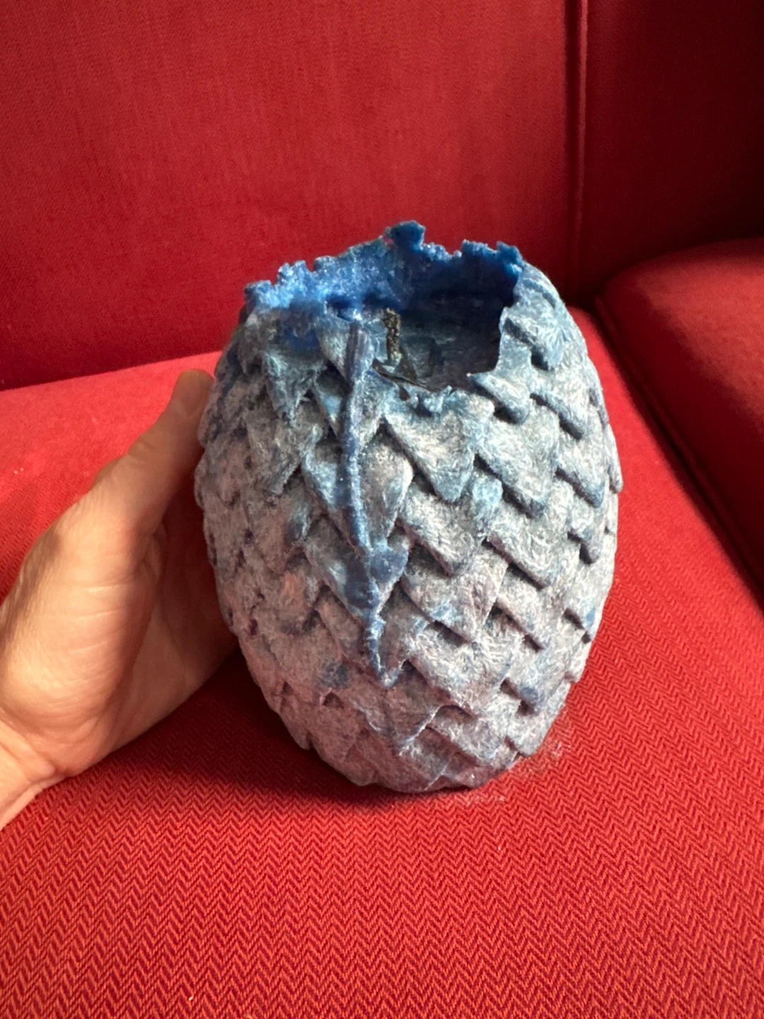 Here is a dragon egg candle m. It's blue and gray and has a cool textured design. It's perfect for adding a bit of fantasy flair to any room. Smells like vanilla