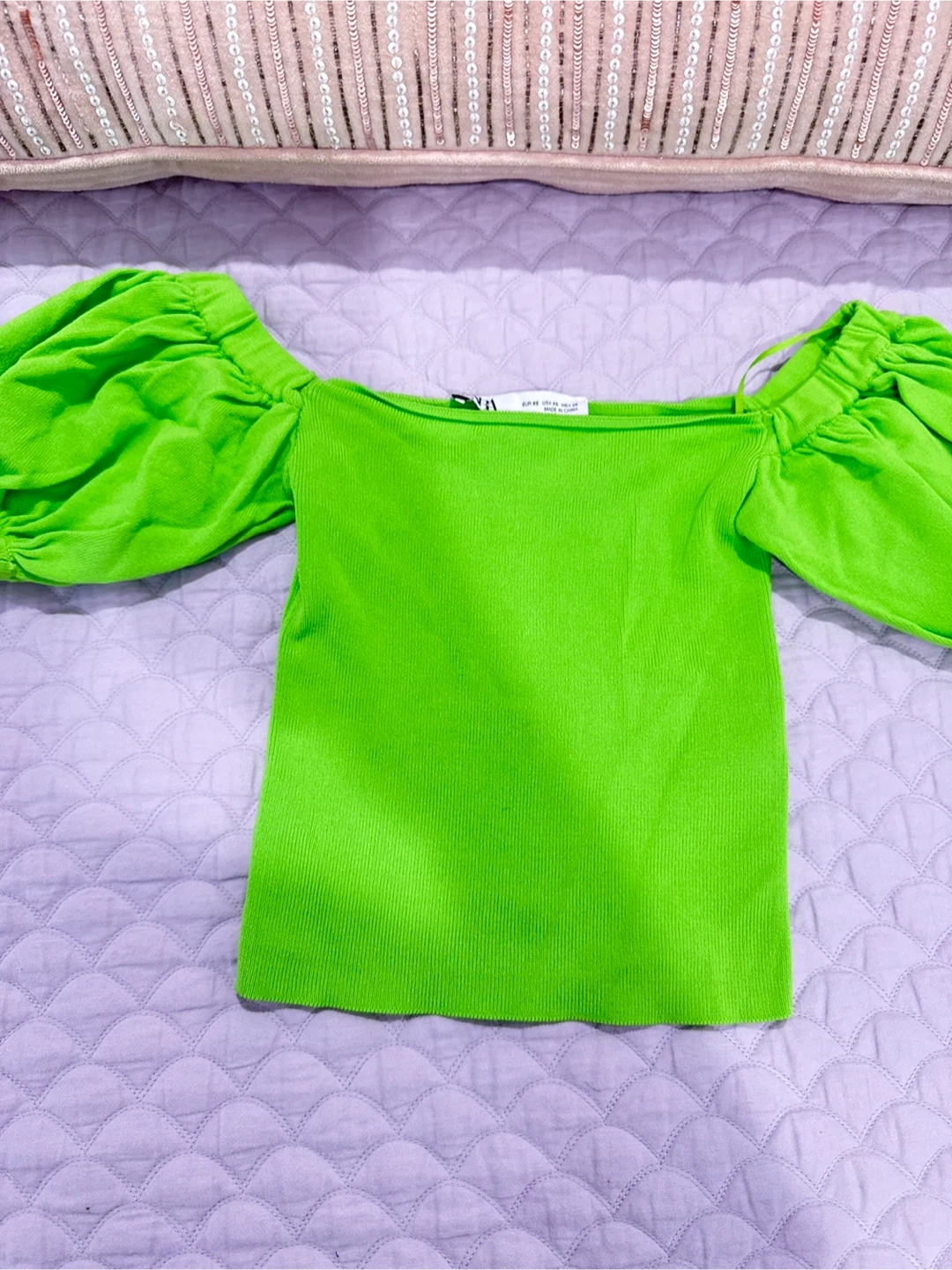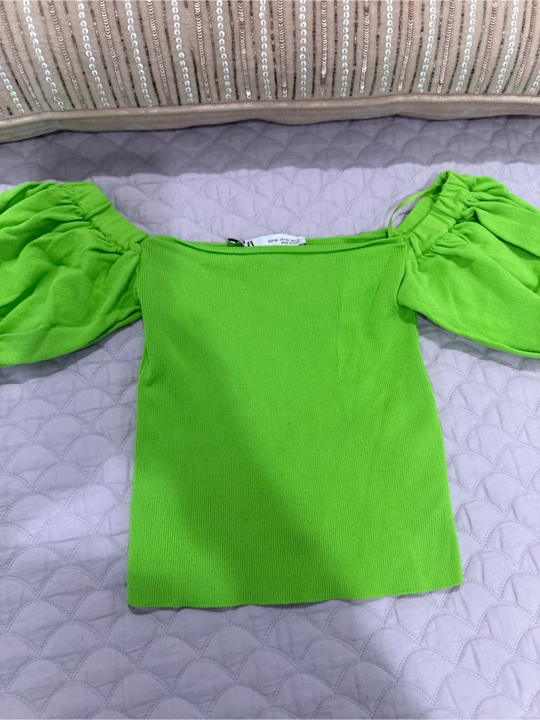 43Selling a Zara top with fun puff sleeves! It's a vibrant green color and a size medium. Perfect for adding a pop of color to your wardrobe