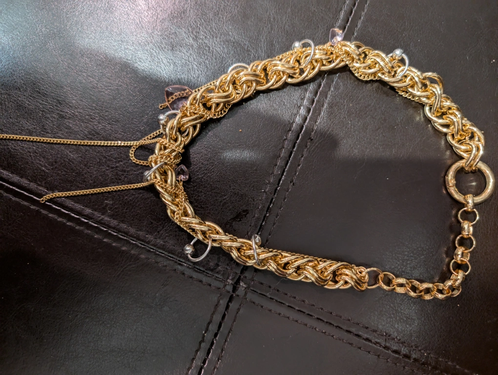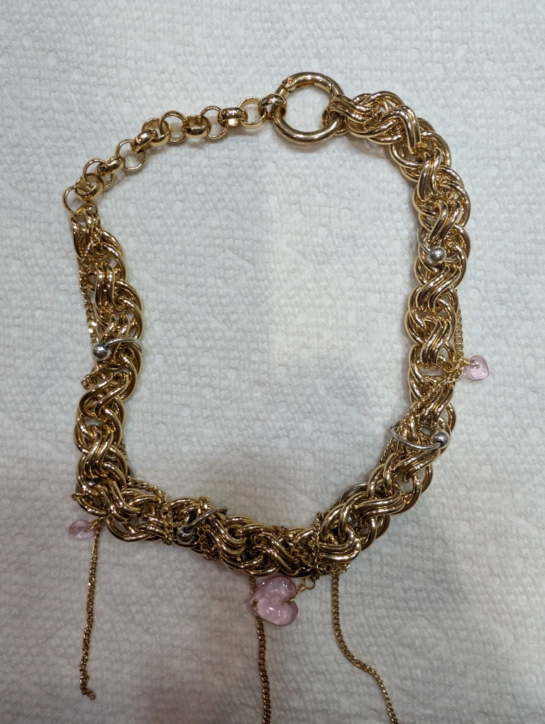 Selling a unique gold tone chunky triple link chain necklace! It features a multi-strand design with delicate pink accents. This necklace is sure to add a touch of elegance to any outfit