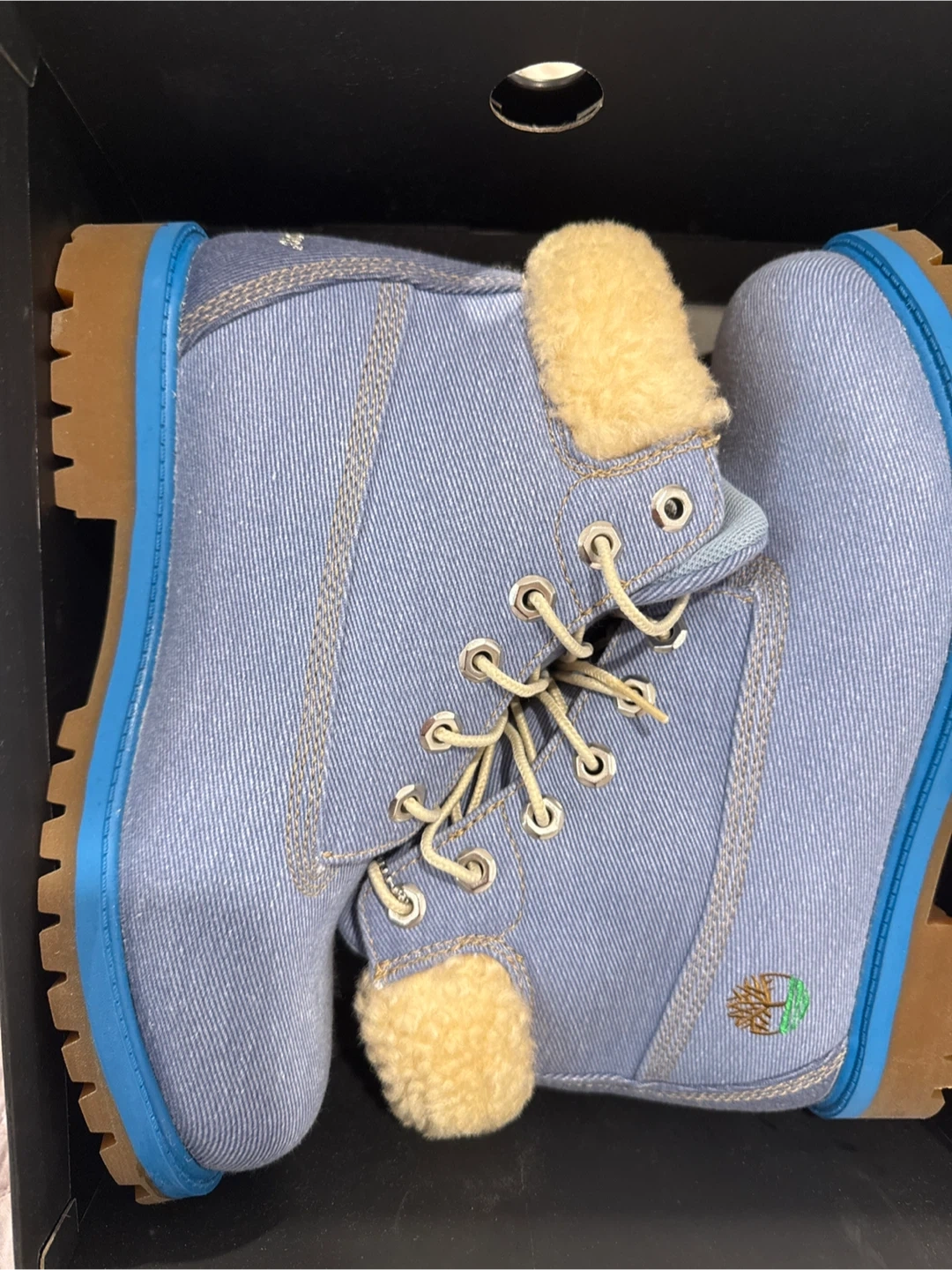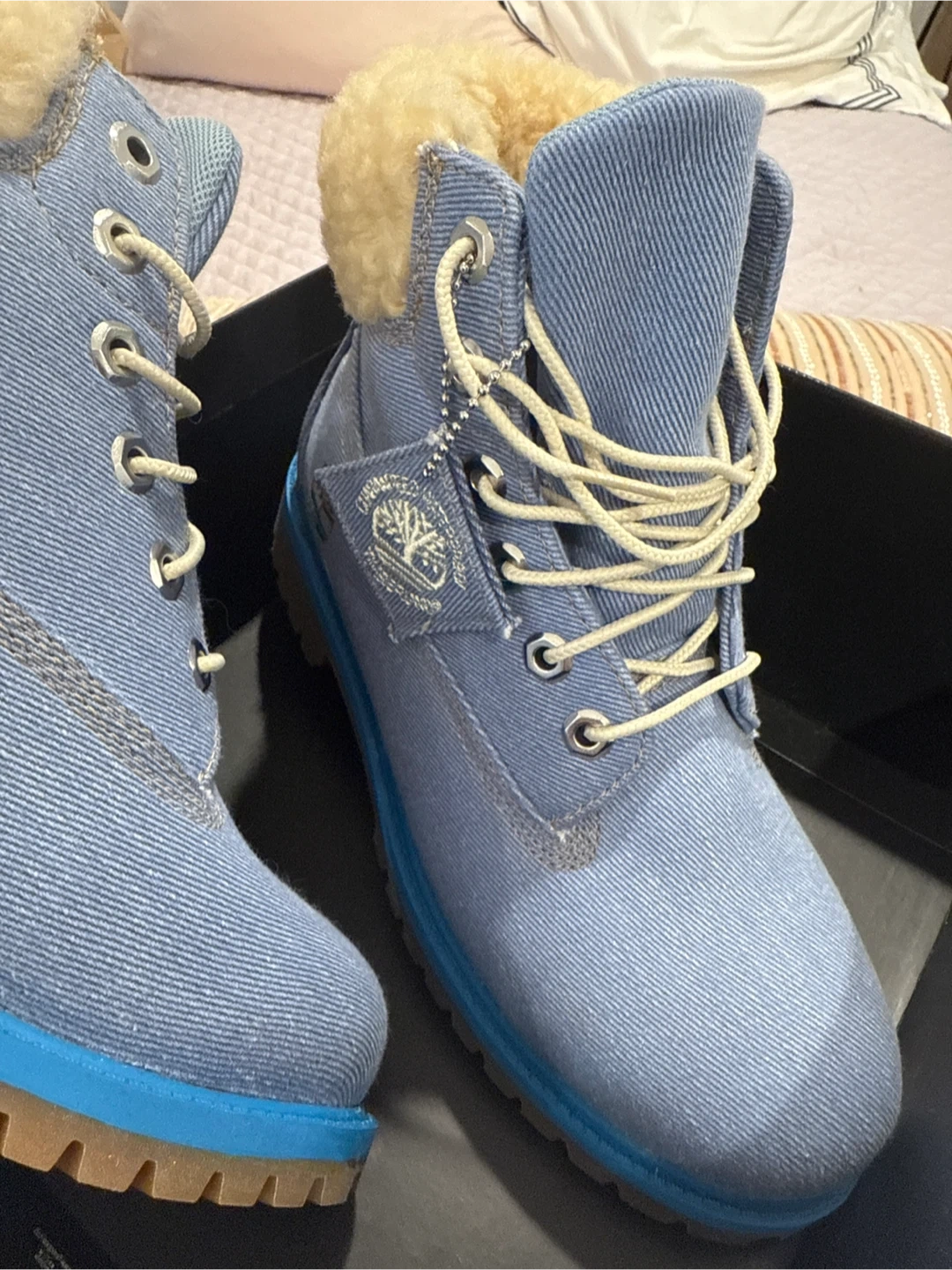 25These Timberland boots are a stylish denim blue with a cozy, furry lining. They come with the box and are ready for winter adventures!