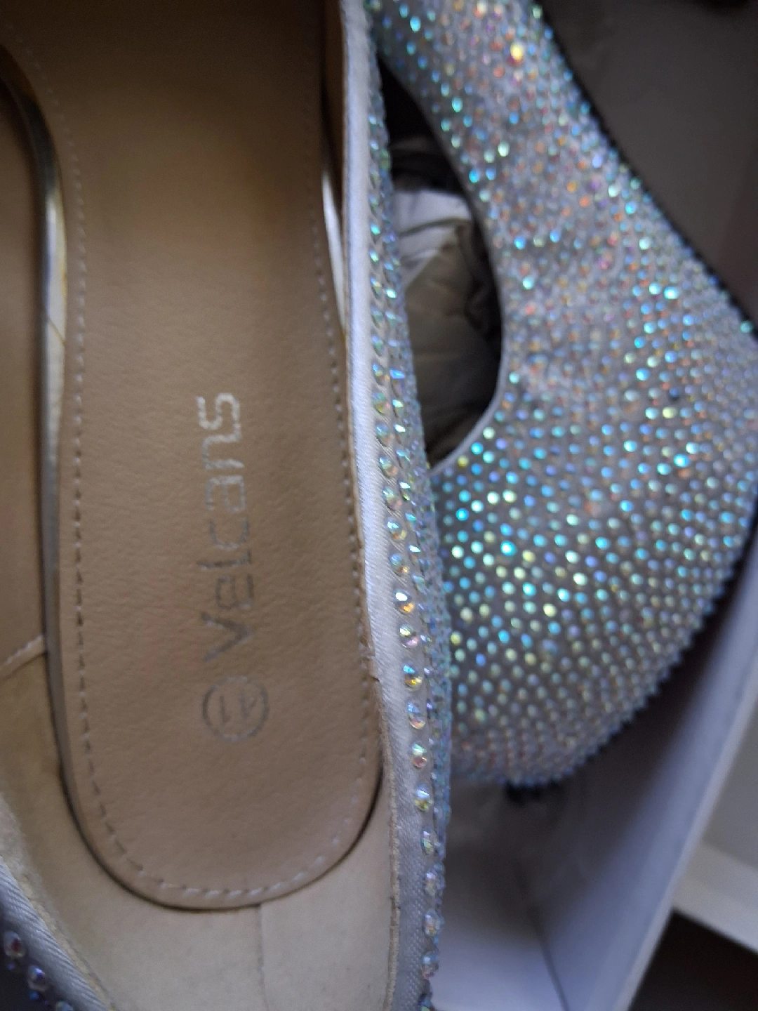 Selling a pair of Velcans heels covered in rhinestones. They are a size 8. The soles are red. Comes with the original box
