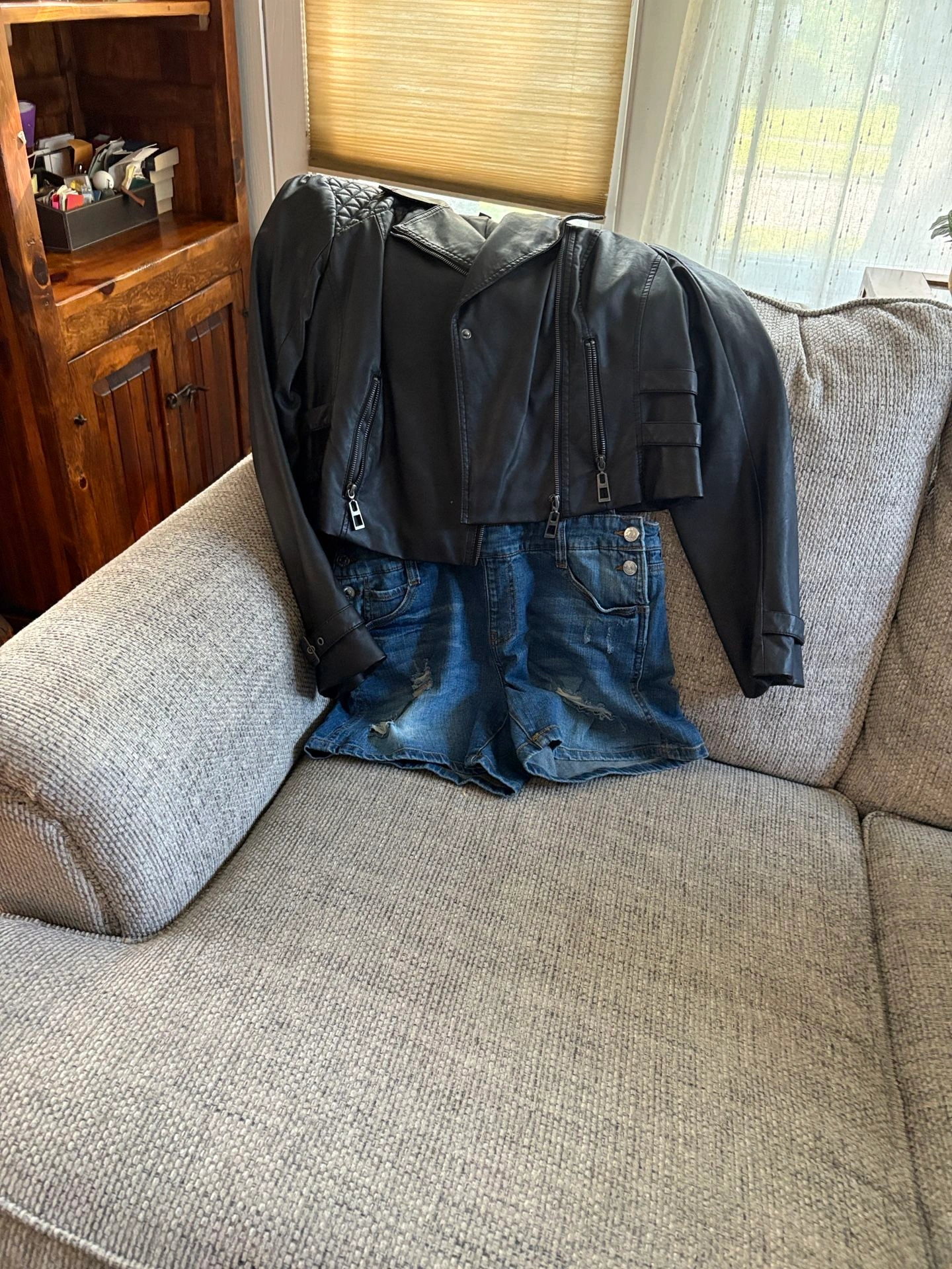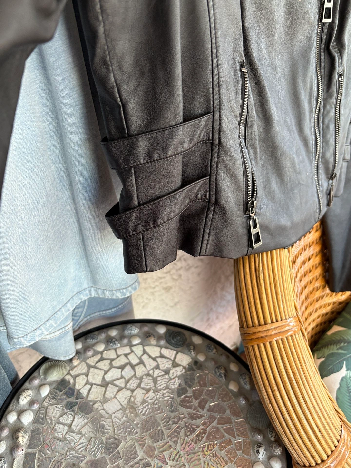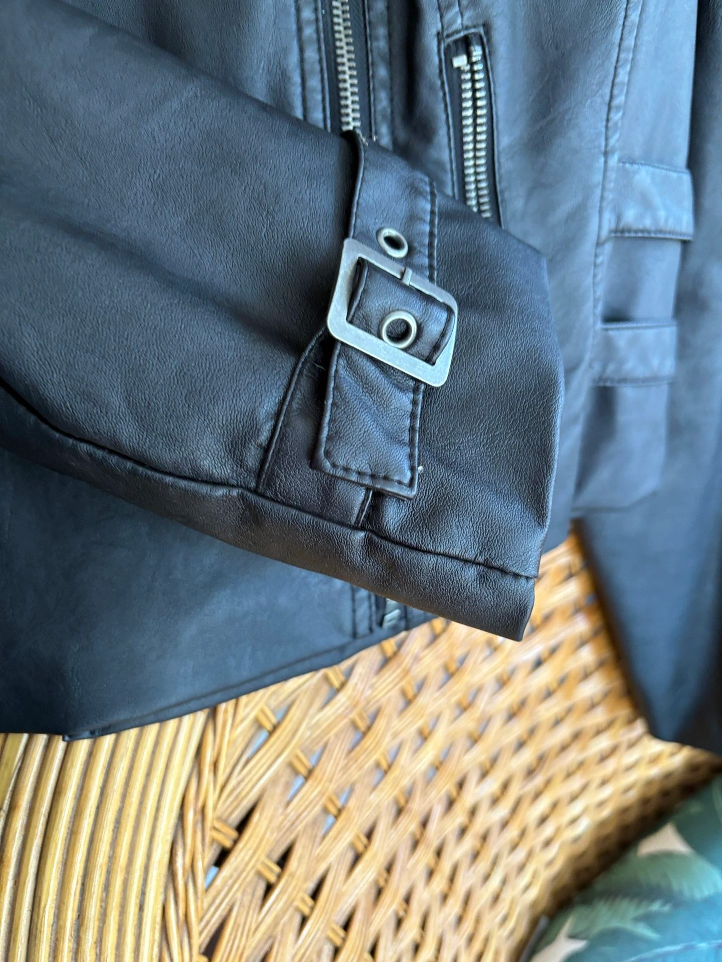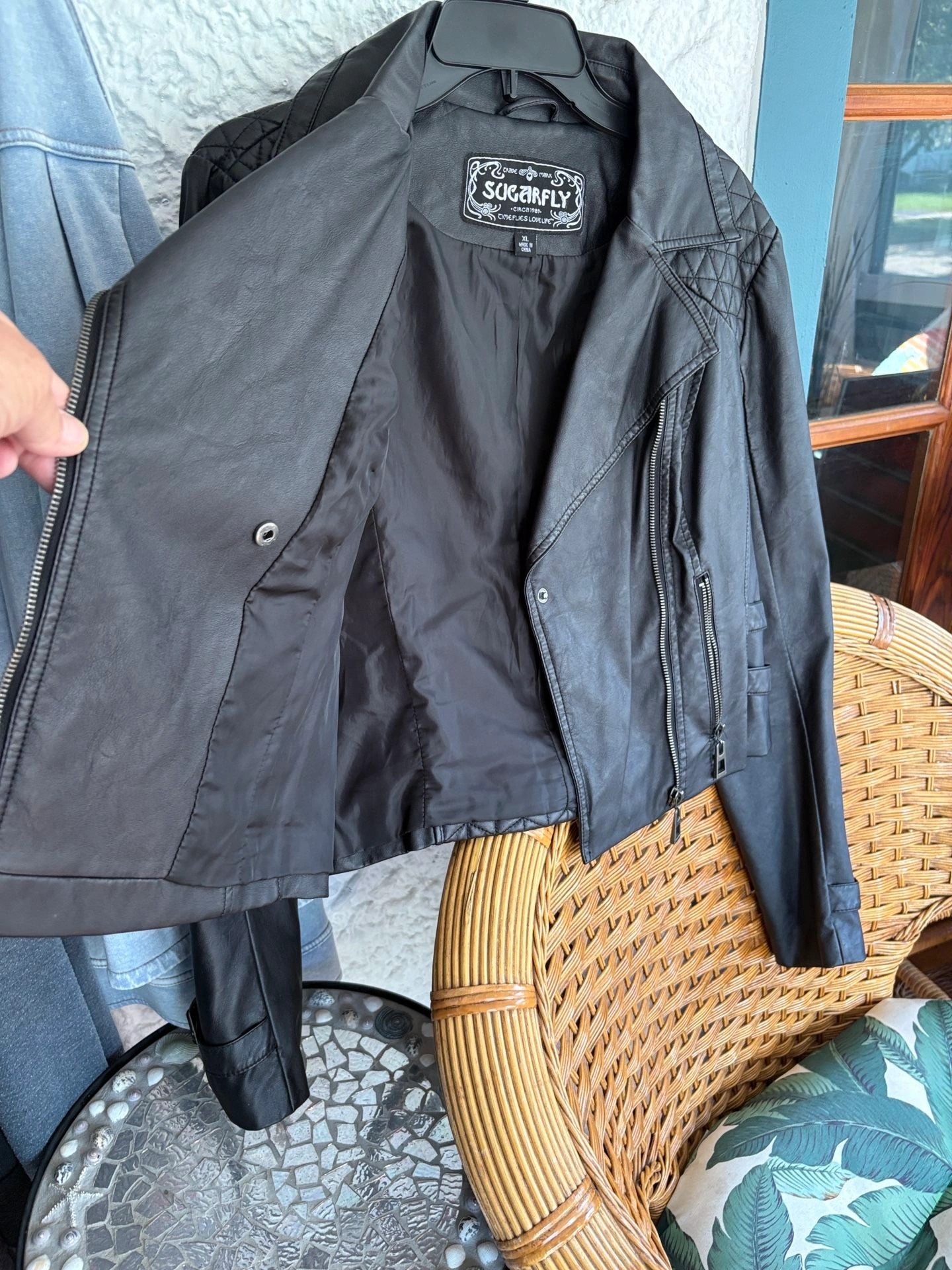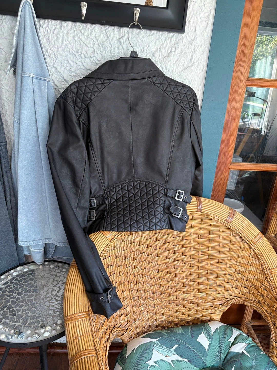 Black leather bomber jacket with quilted detailing at shoulders. Zipper and buckle details. Size Type: Juniors Size: XL Color: Black Style: Bomber jacket Brand: Sugarfly