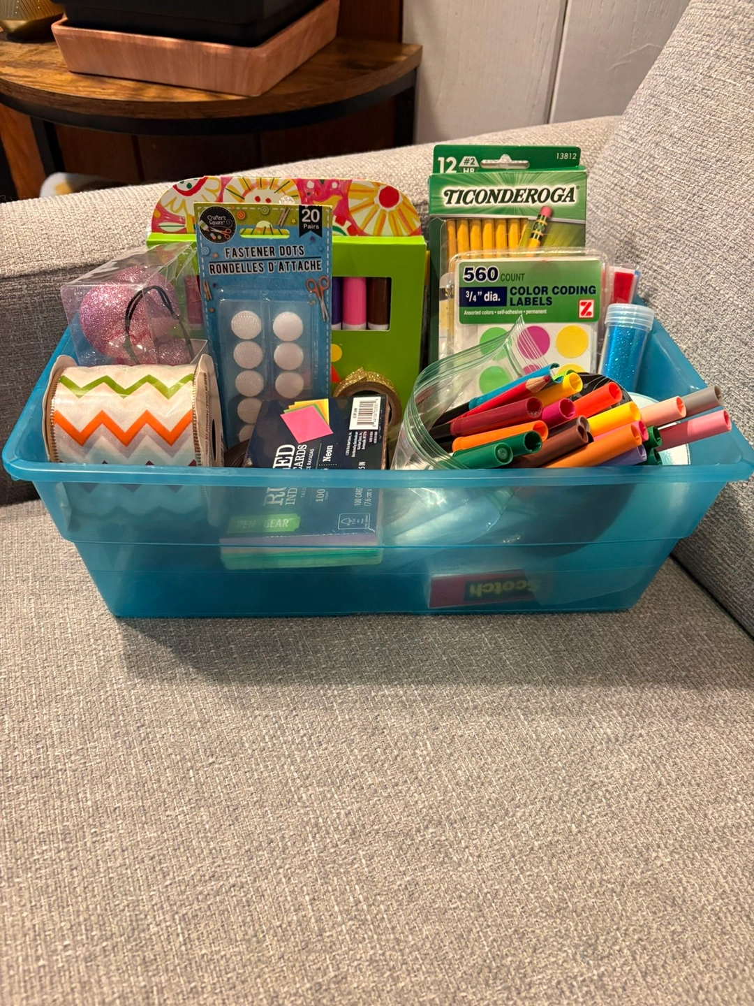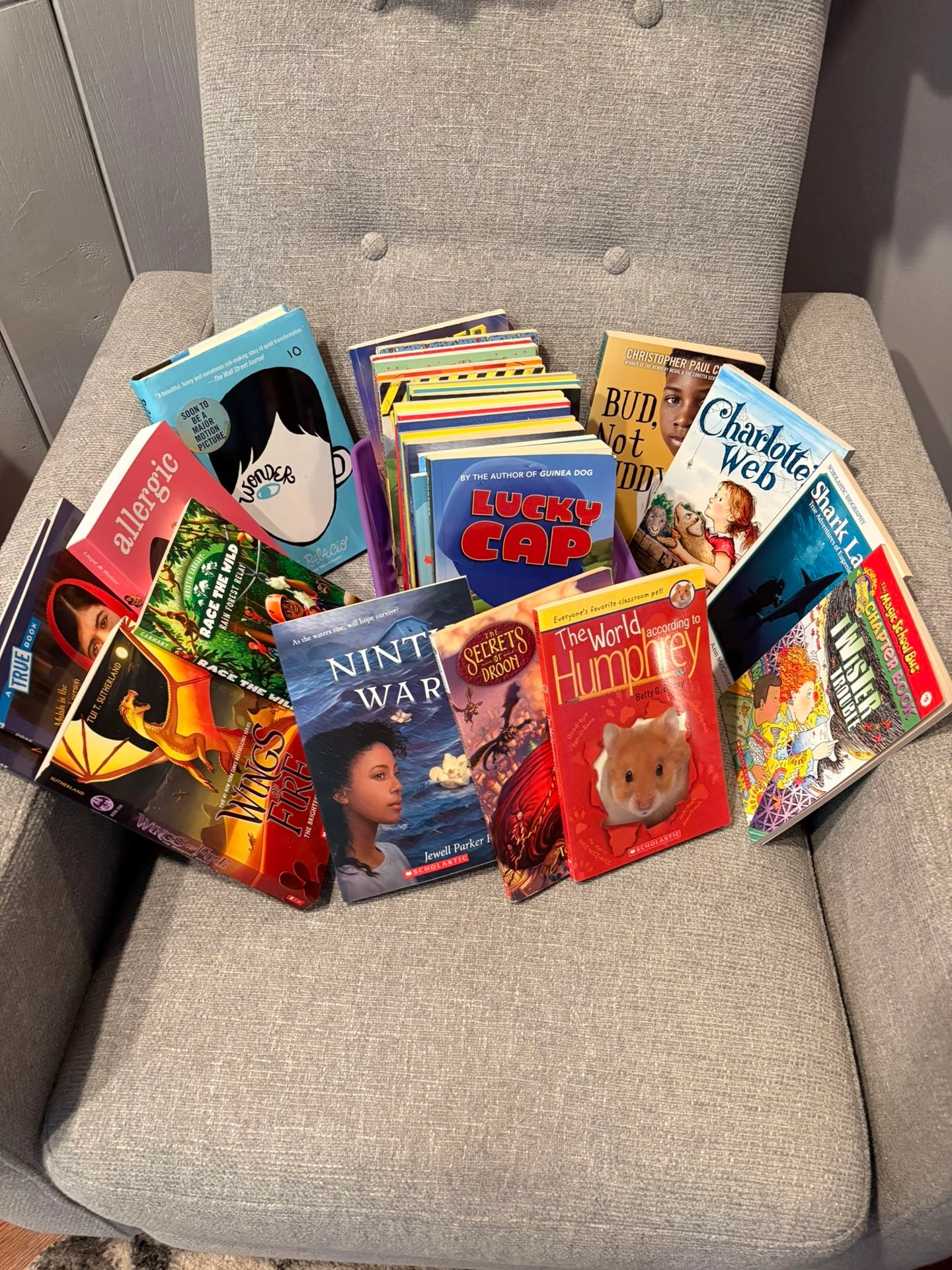 Back to school items for the classroom. A collection of 36 books mostly all brand new. A basket of teacher items like crafts and office supplies. Books are mostly 4th grade level.