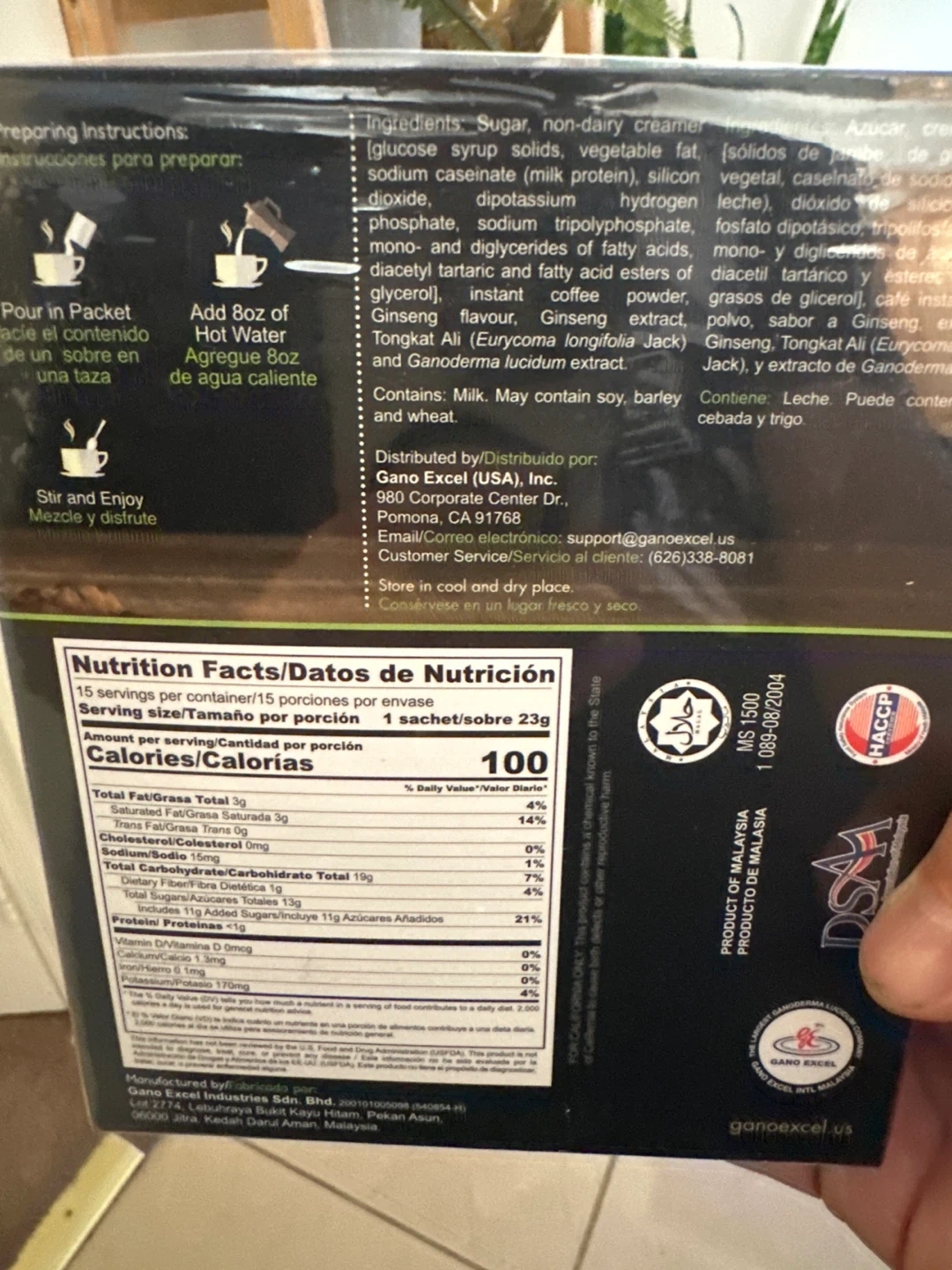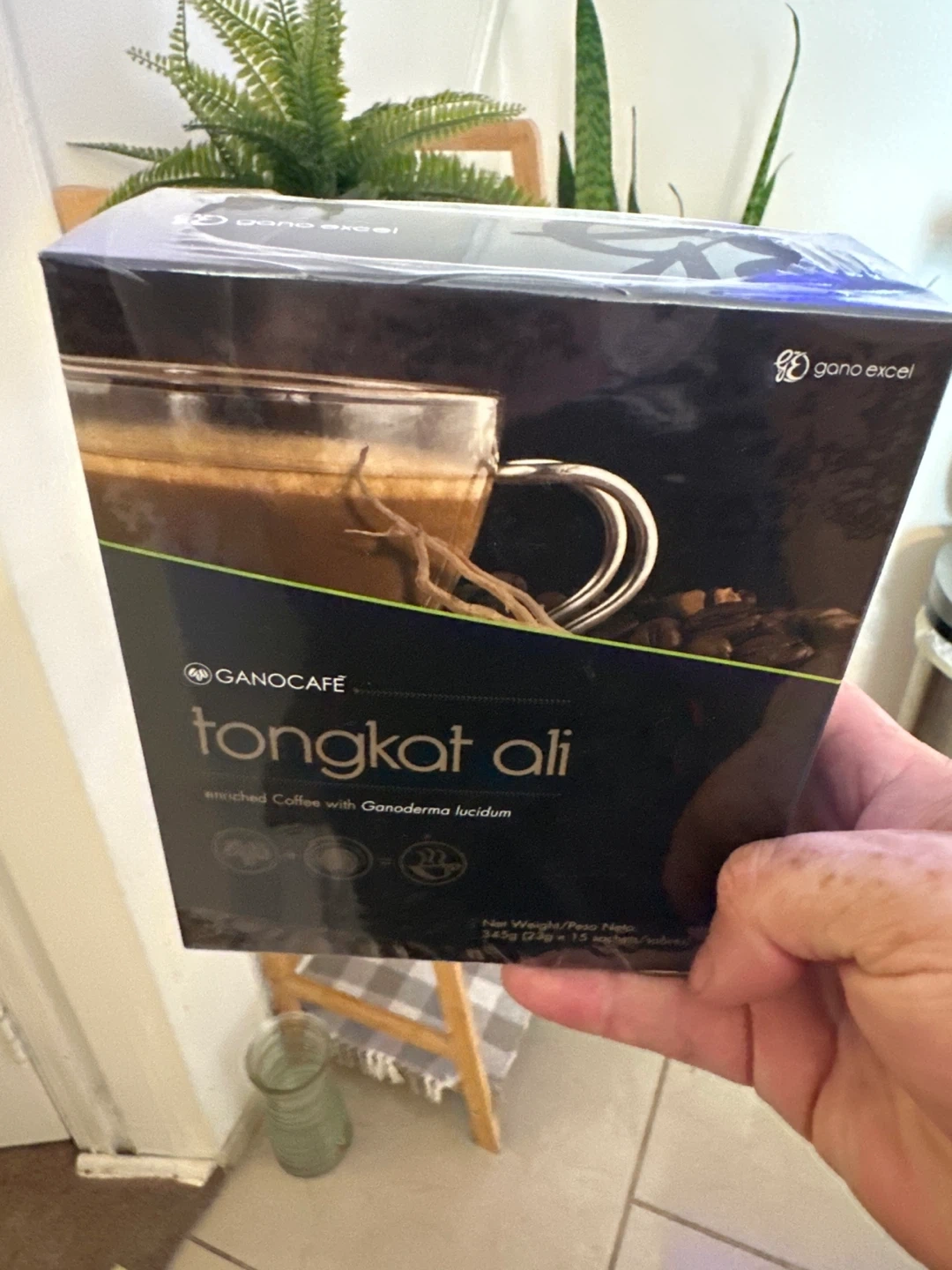 Selling a box of GanoCafe Tongkat Ali enriched coffee. It is made using an exotic blend of premium roasted coffee, ginseng, tongkat ali, and Ganoderma lucidum. Each box contains 15 sachets, each weighing 23g.