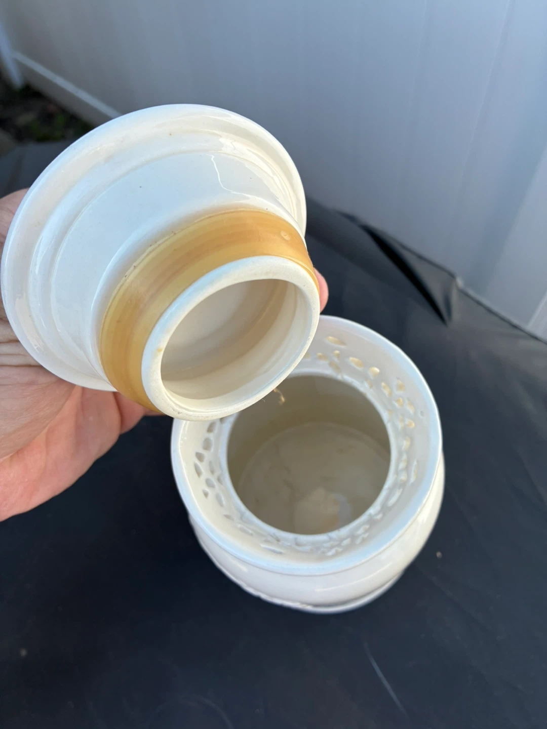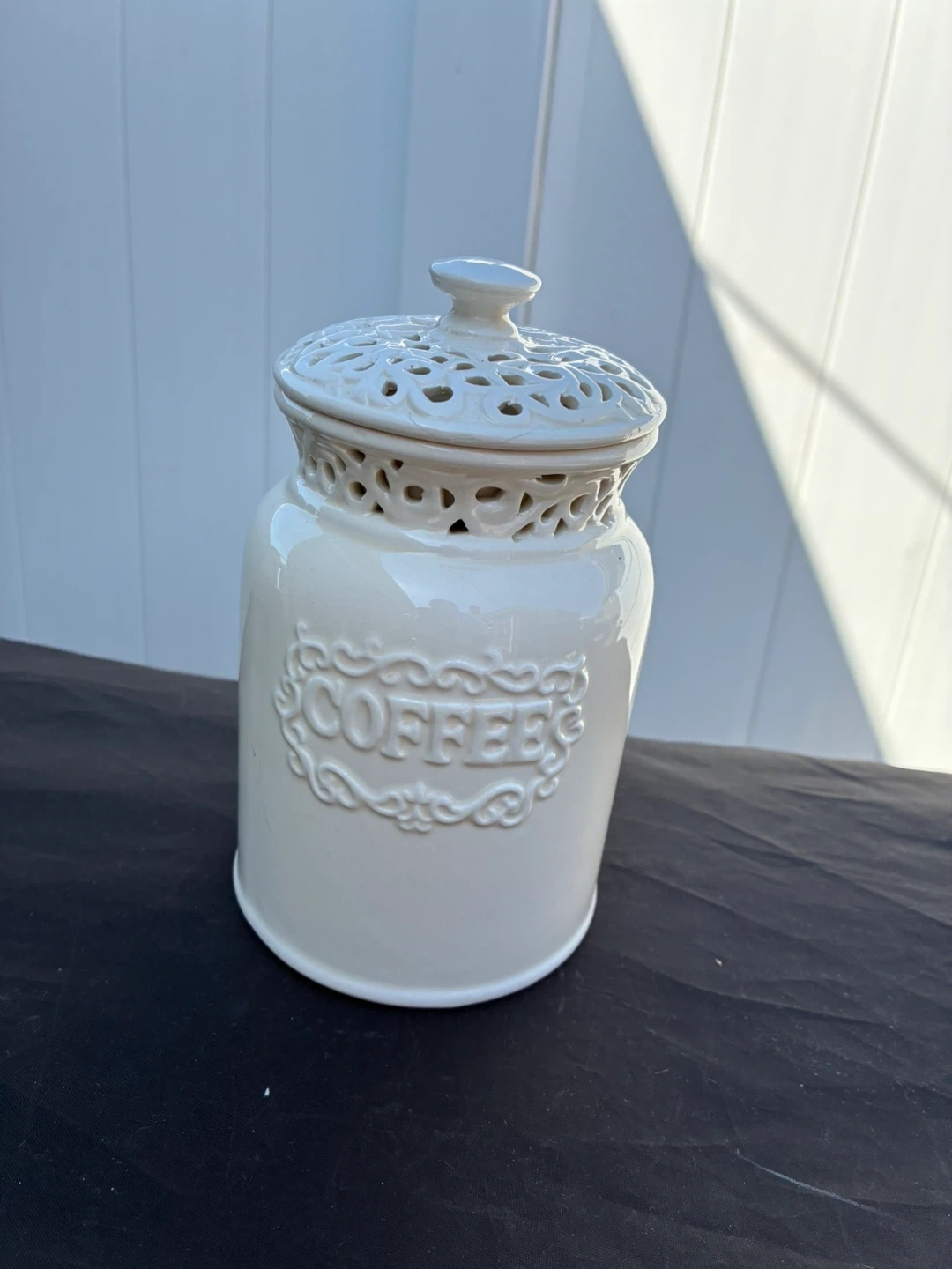 California Pantry Coffee Canister Selling a cute coffee canister from California Pantry! It's made of ceramic and has a lovely, detailed design. Perfect for storing your coffee beans or grounds in style Pick up in Norridge Price $ 10
