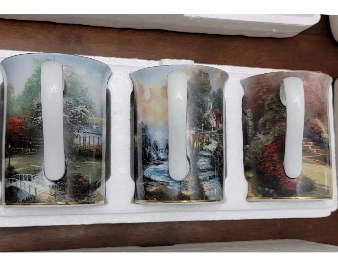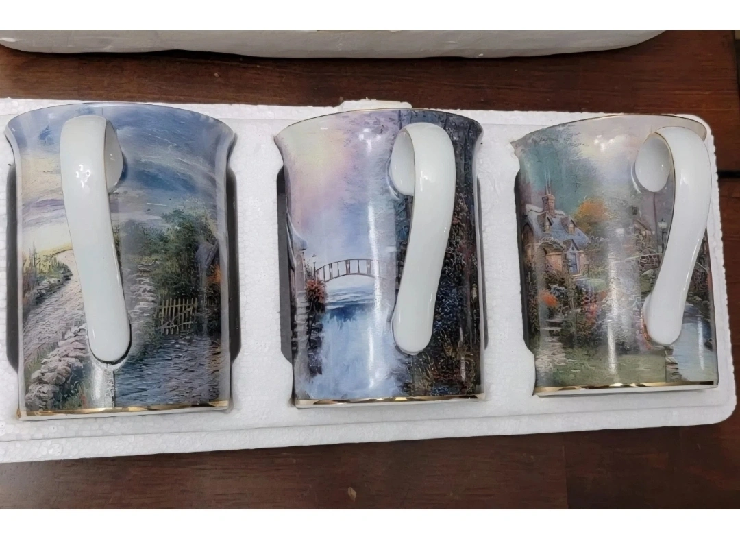 Set of 12 Thomas Kinkade Painter of Light coffee mugs. These mugs feature various landscape scenes and are in excellent condition. Perfect for collectors or anyone who enjoys beautiful art with their morning coffee! They all come in their original packaging