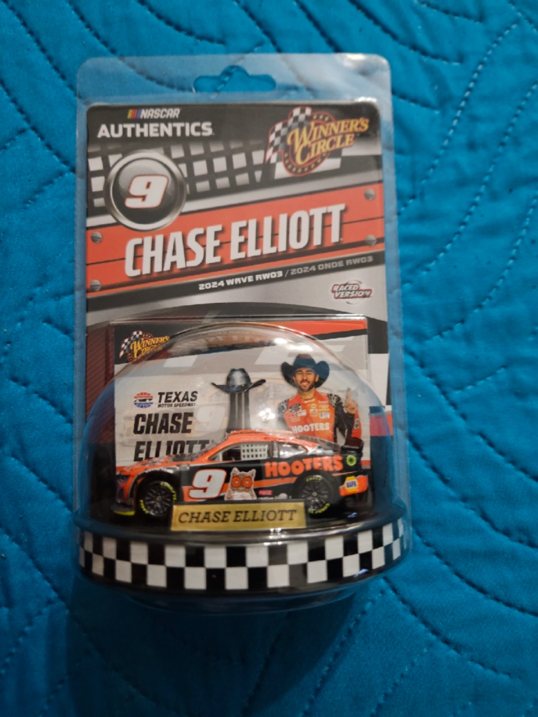 Selling a NASCAR Authentics diecast car featuring Chase Elliott's #9 Hooters car! It's in its original packaging and ready for a new home. The car is a 1:64 scale diecast model. The packaging includes details about the race in Texas Motor Speedway, including the time of race, start position, and number of cautions. A great addition to any NASCAR collection! PICK UP ONLY