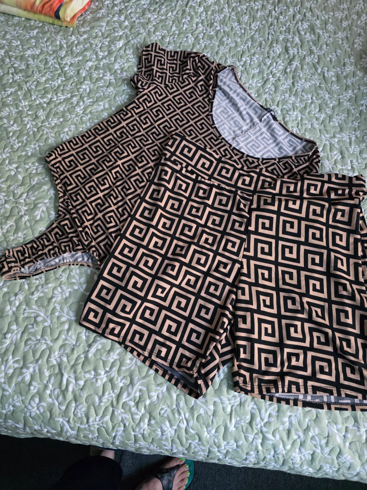 Here's a fun matching set! It includes a bodysuit and a shorts, both with a geometric pattern. Perfect for a night out or just feeling stylish!