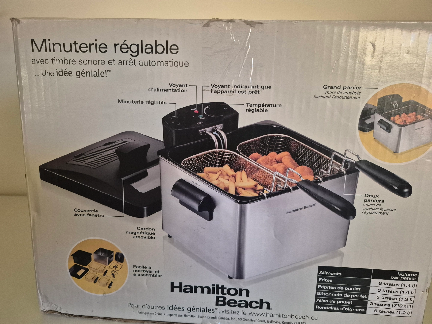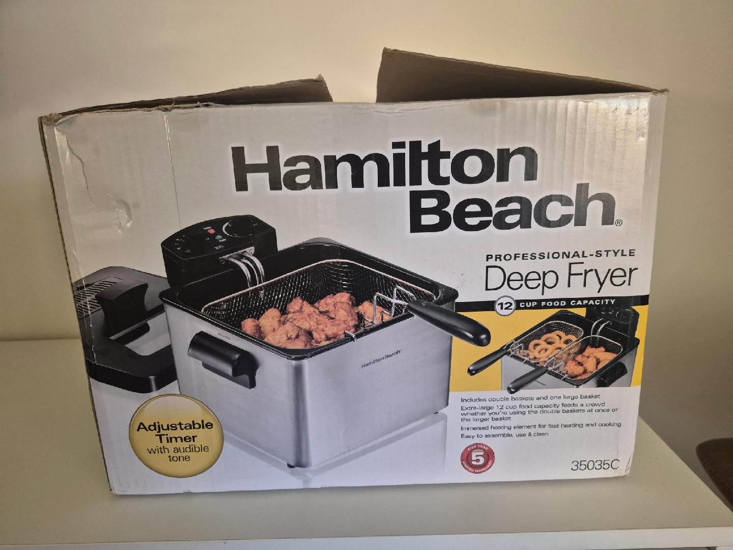 Selling a Hamilton Beach Professional-Style Deep Fryer. It's in excellent condition and comes with the box! It has a 12 cup food capacity and includes double baskets and one large basket. Features an adjustable timer with an audible tone and an immersed heating element for fast heating and cooking. Easy to assemble and clean. it comes with box never used.