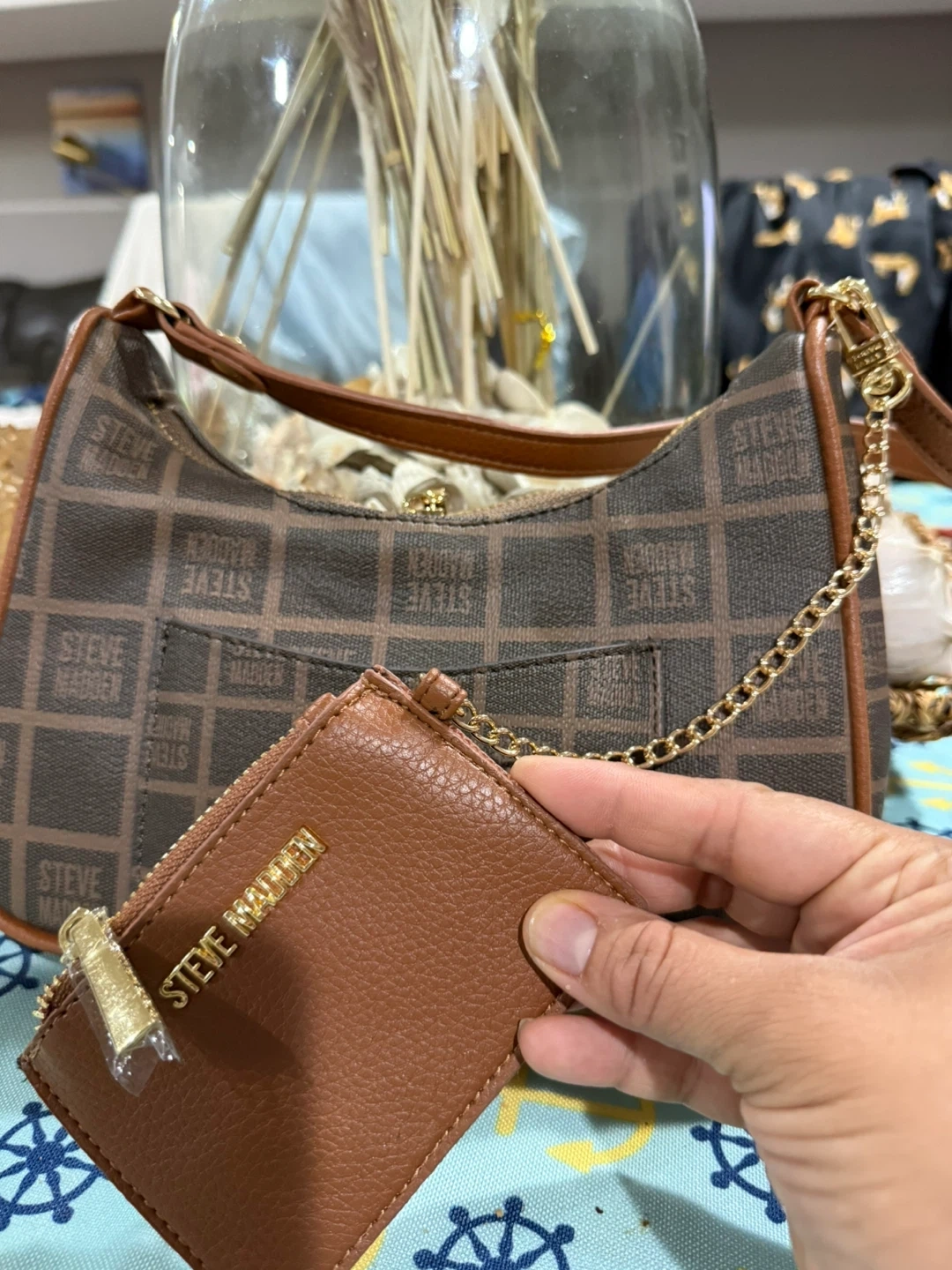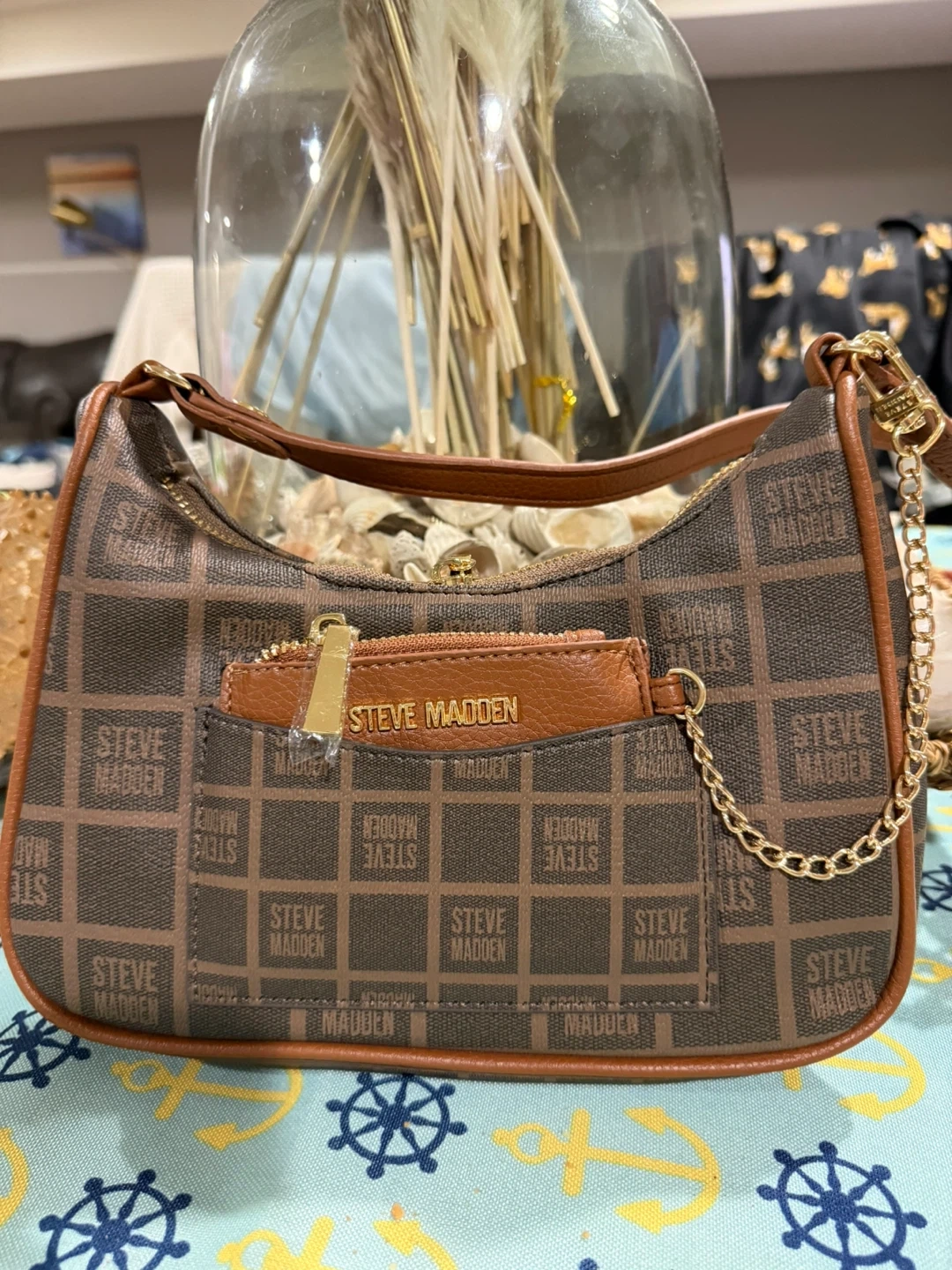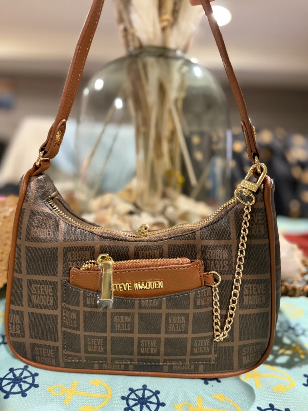 This is a Steve Madden shoulder bag in brown. It features a unique design with the brand name patterned throughout. The bag also has a small attached wallet and a chain detail. It's perfect for adding a stylish touch to any outfit!