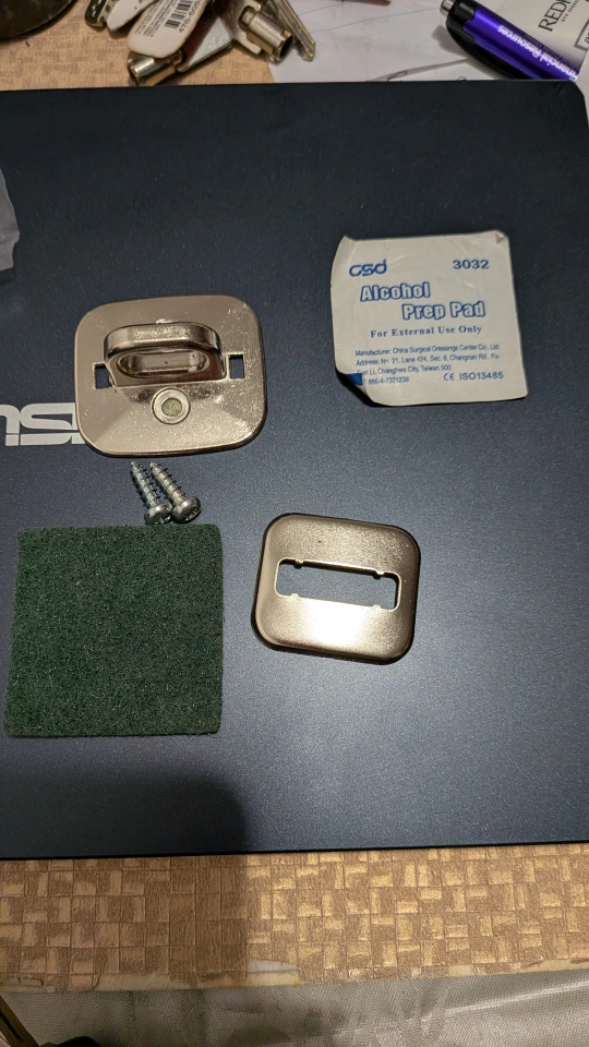 Selling a hardware set that includes two metal pieces, screws, and a green pad. Also included is a CSD Alcohol Prep Pad for external use only.