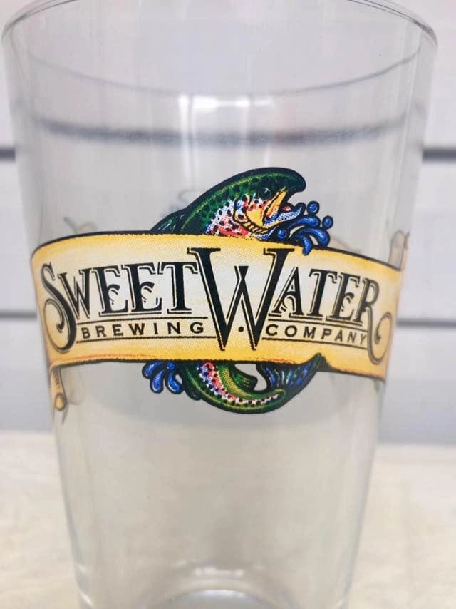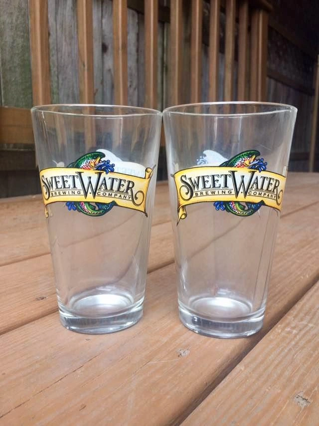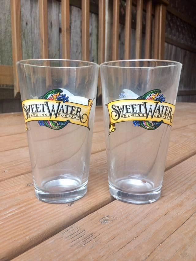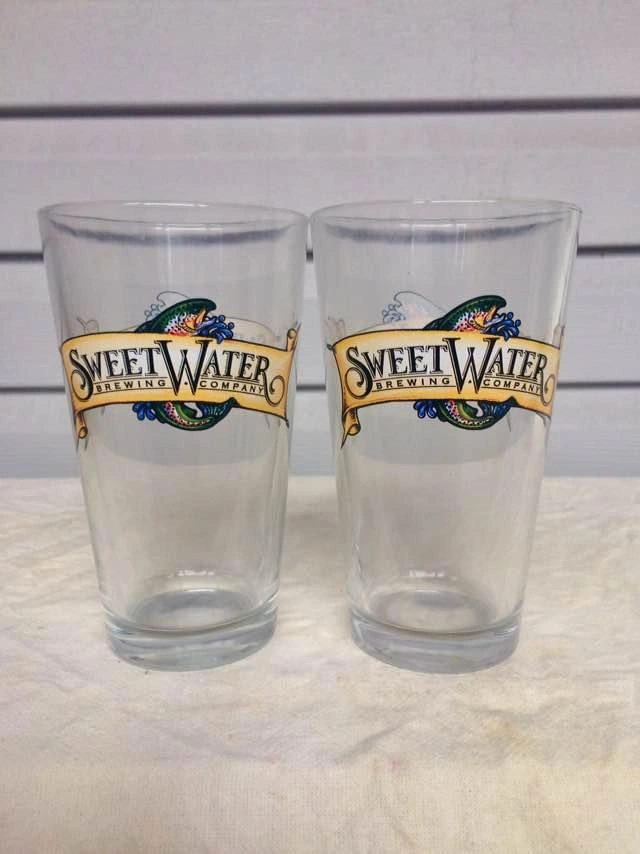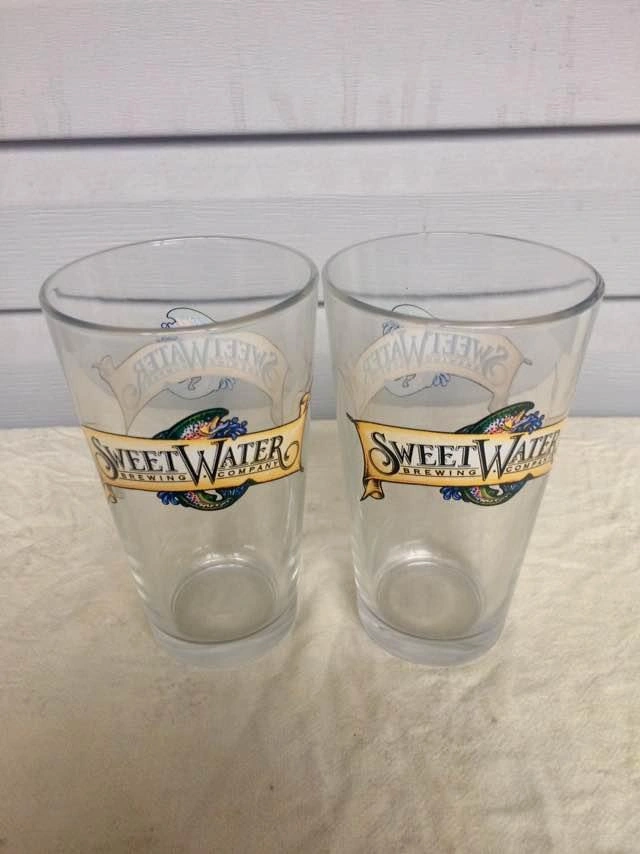Pair Of SweetWater Brewing Company 16 Oz. Pint Glasses - Brand New Glasses feature the banner logo of SweetWater Brewing Company from Atlanta, Georgia. These are brand new and have never been used. The glass is thick and has a weighted bottom, the signs of a high quality pint glass. From a smoke and pet free home. Check out in person before purchasing. Thanks for looking.