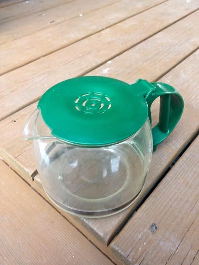 10 cup carafe features a green lid and handle. Pot is in excellent condition with no chips or cracks. Measures 5” tall x 8” wide including the handle. Bottom diameter is 6” and top mouth diameter is 4 3/4”, 5 1/2” including spout. From a smoke and pet free home. Check out in person before purchasing. Thanks for looking.