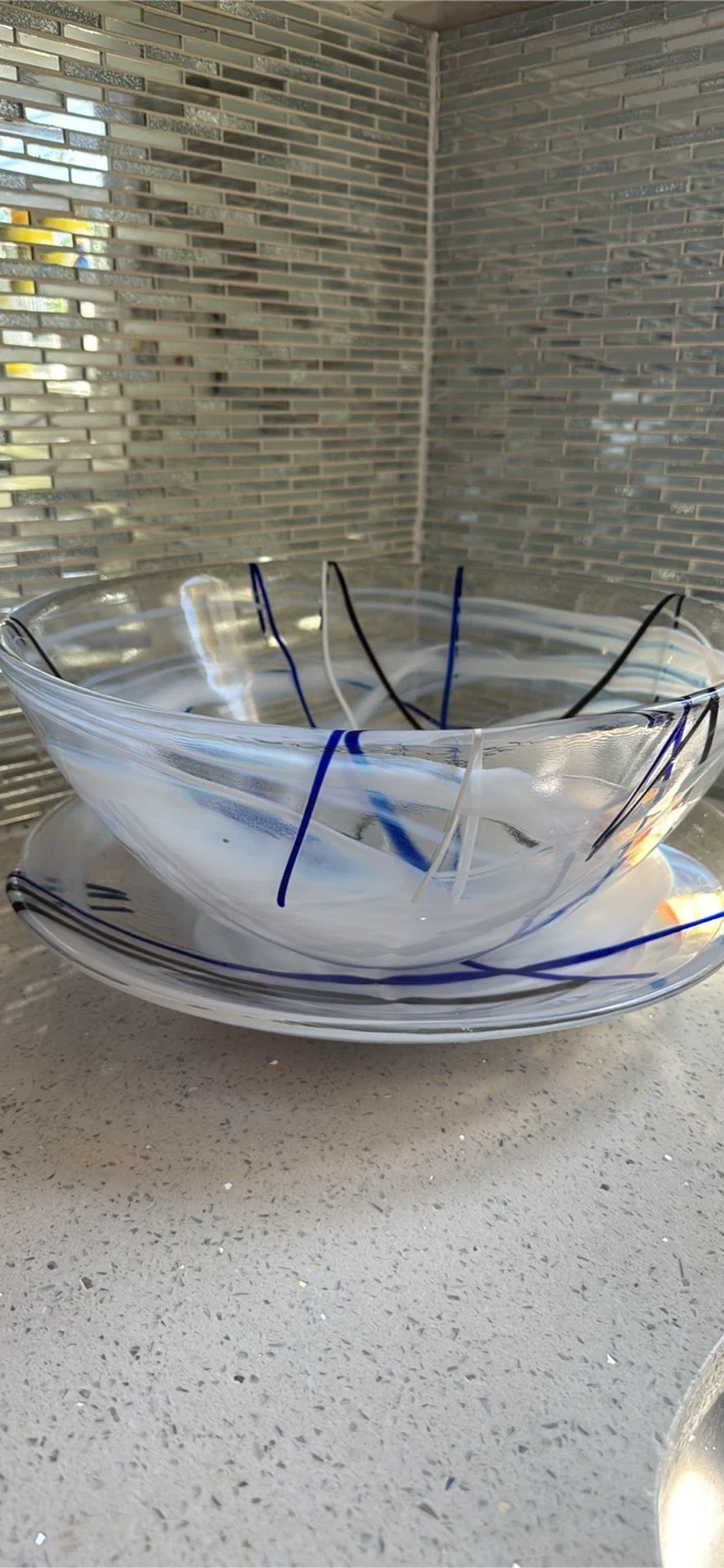 25Selling a decorative glass bowl and plate set. It has a unique design with white, blue, and black accents. It would be a beautiful addition to your home decor