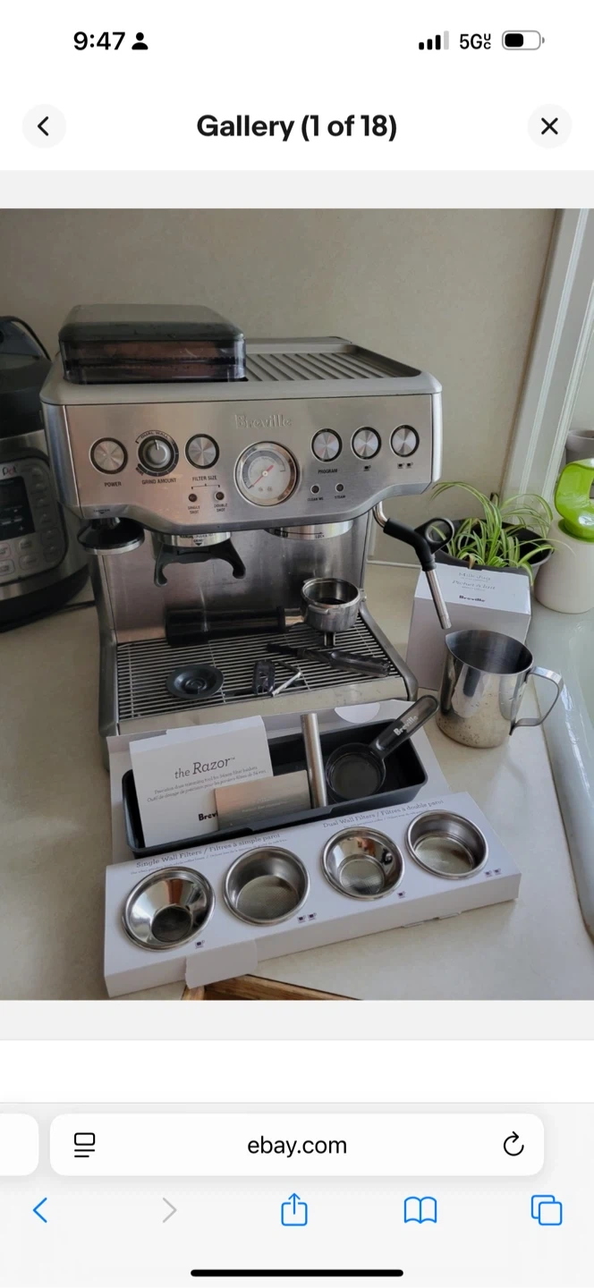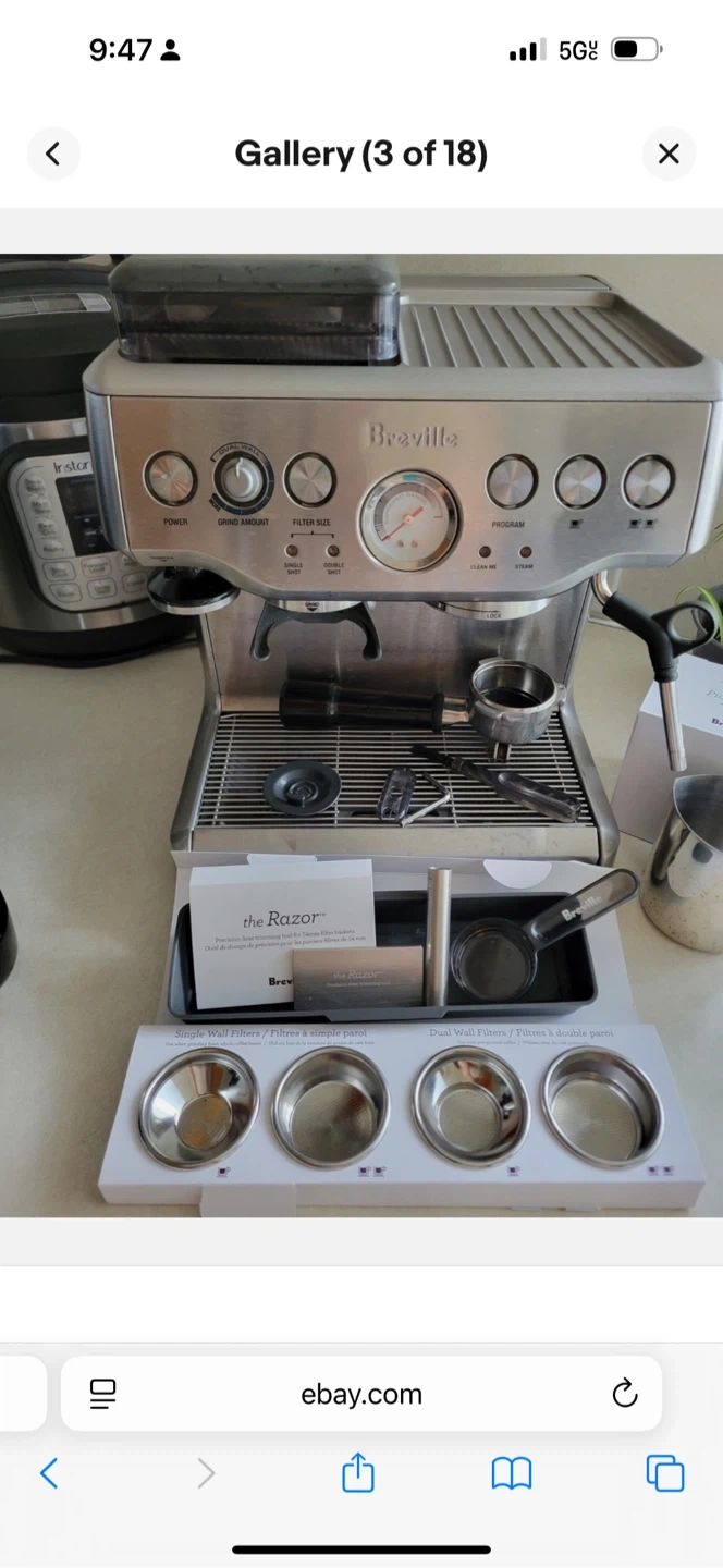Selling a Breville Barista Express espresso machine in great condition! It comes with all the accessories shown in the pictures, including the Razor tool. This machine is perfect for making delicious espresso drinks at home. Retails for $599.99