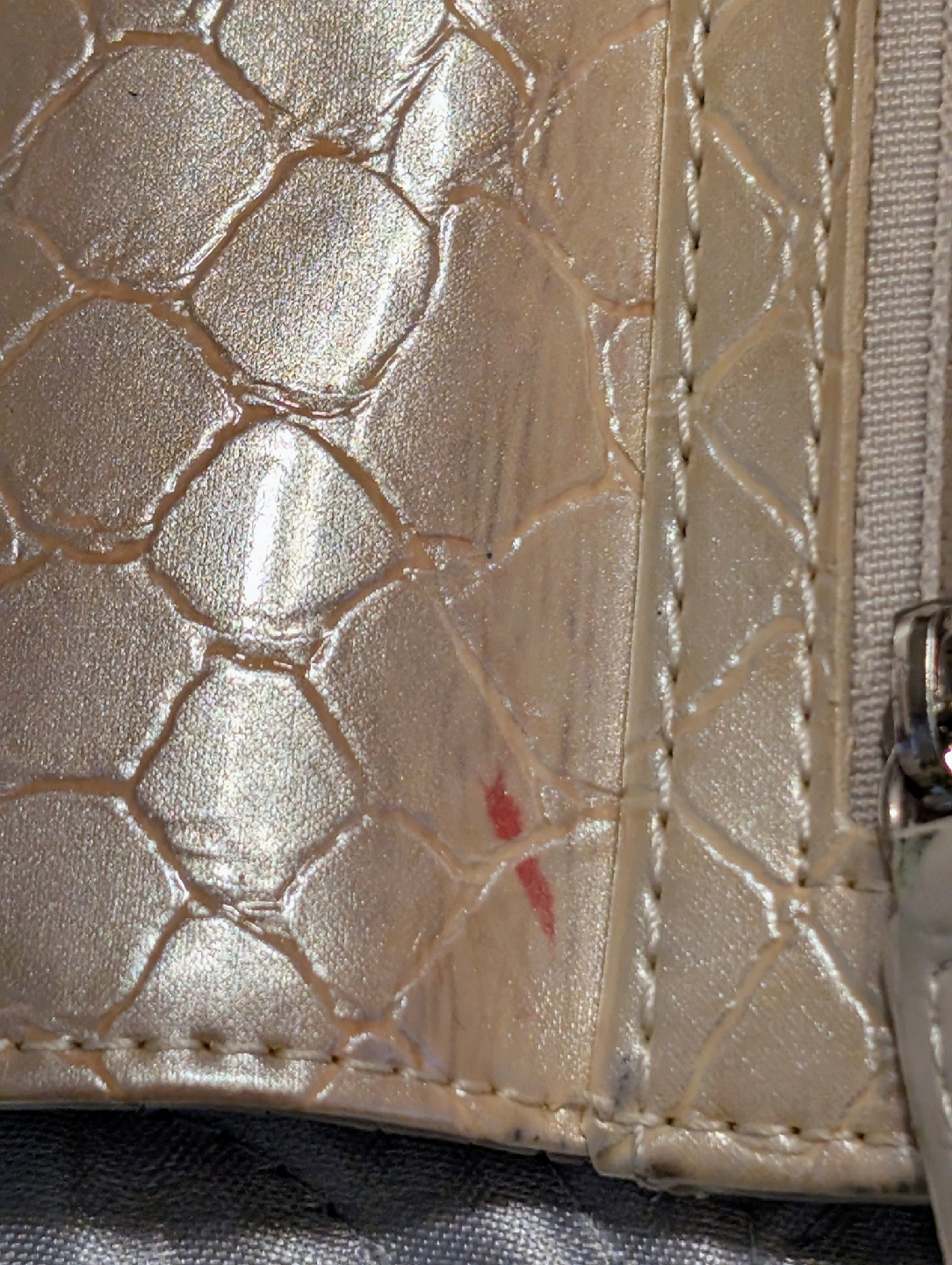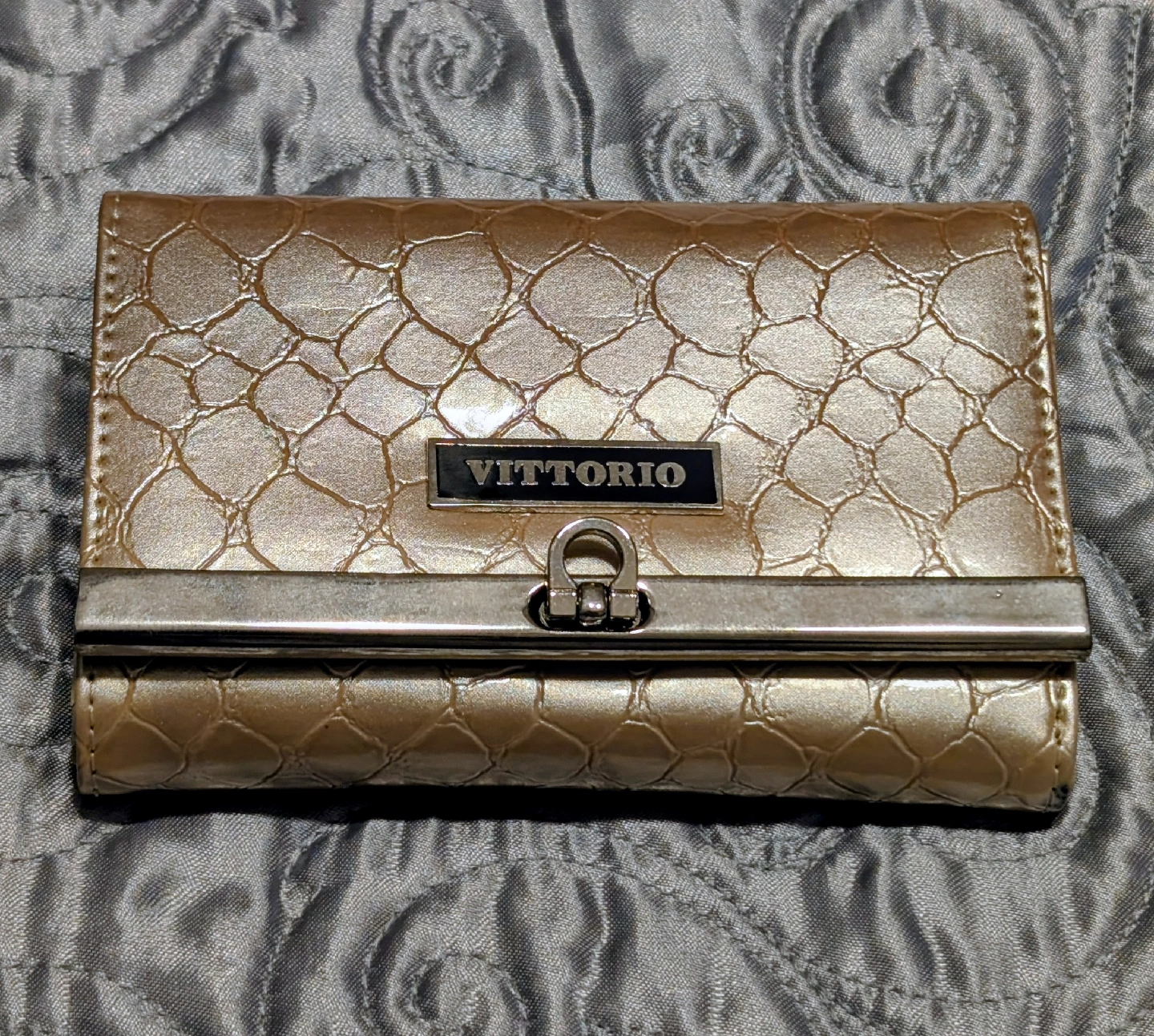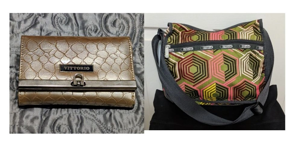 Selling a stylish and practical two-piece bundle: a LeSportsac crossbody bag and a VITTORIO wallet! Both are in great, gently used condition. 1. LeSportsac Crossbody/Shoulder Bag Brand: LeSportsac Style: Small to Medium Crossbody/Hobo style with adjustable strap. Color/Print: Unique and eye-catching green, pink, and brown geometric hexagon pattern. Features: Lightweight nylon, zip-top closure, exterior zippered pockets (visible LeSportsac zipper pulls). Perfect for everyday use! Wear Notes: Light pen mark in the interior lining (not visible from the outside- see picture) 2. VITTORIO Tri-Fold Wallet Brand: VITTORIO Color: Gold/Light Tan with a textured (possibly faux crocodile or reptile) finish. Style: Tri-fold with a silver-tone metal clasp/frame and VITTORIO plaque. Features: Plenty of card slots and compartments (please see photos). Wear Notes: Front- General scuffing/discoloration on the textured material (see photos). Interior- There is some peeling/cracking on the interior material near the fold (see close-up photo). Some general smudges/marks on the interior lining. Exterior Back- Some darker smudges/marks visible on the textured material and a pink/red ink mark (see close-up photo). Why buy this bundle? Coordinated: The gold/tan wallet would pair nicely with the colors in the bag print. Great Value: Get two quality accessories for one low price!