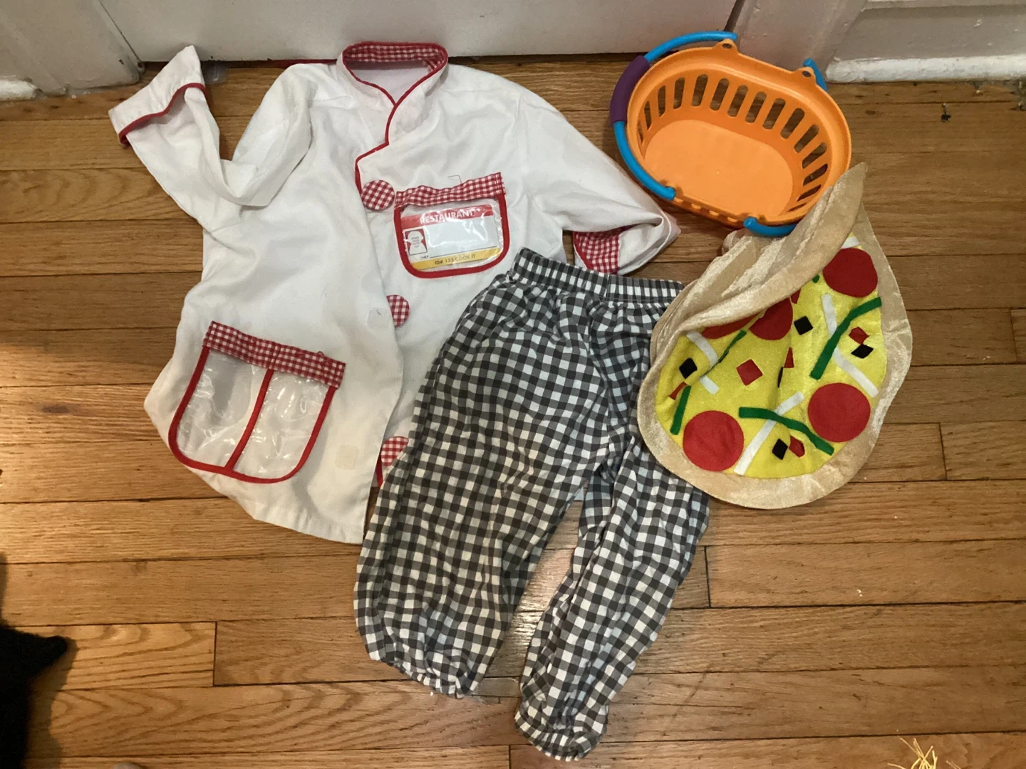 370Adorable chef costume set with a pizza slice hat and shopping basket! Perfect for dress-up and imaginative play
