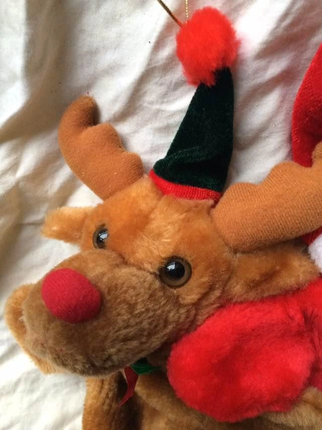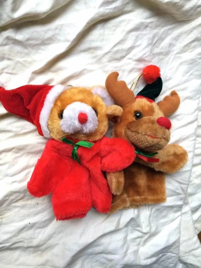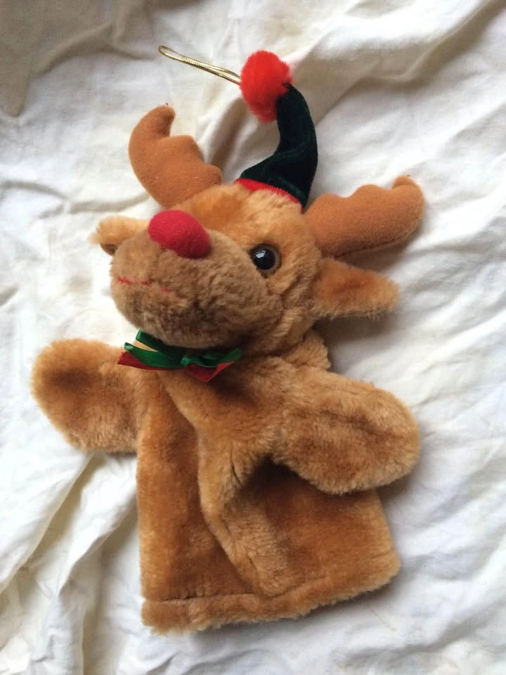 Pair Of Christmas Ornaments/Hand Puppets - Excellent Condition Rudolph the Red-Nosed Reindeer and Christmas Teddy Bear hangable ornaments that are also hand puppets. Price is for the pair. Each one measures 11 x 8 inches. Unique holiday gift for a child. Each ornament has a gold thread for placing on the Christmas tree. One hand controls the head and both arms when used as a puppet. From a smoke and pet free home. Thanks for looking.