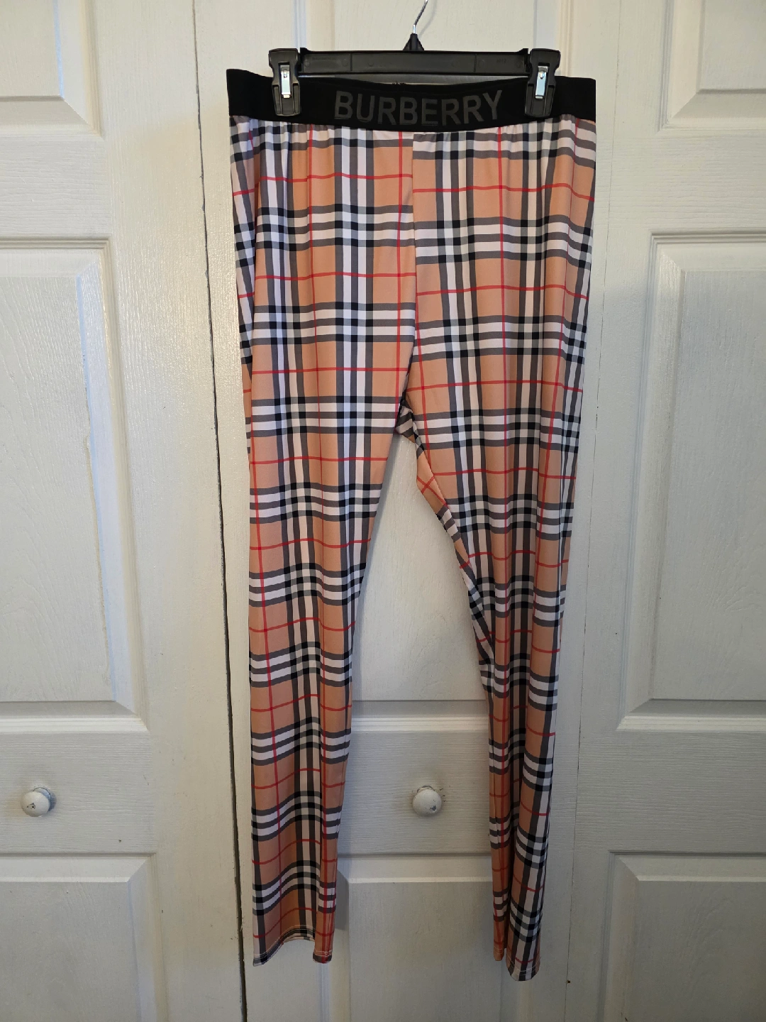Burberry leggings with a checkered pattern and black elastic waistband. They appear to be in good condition and ready for a new home!
