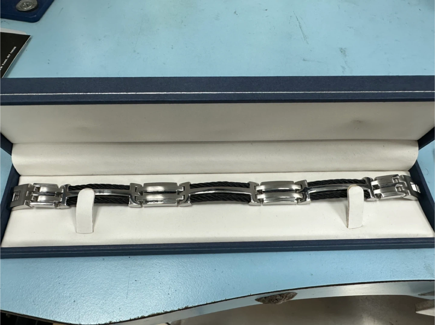 Here's a men's stainless steel bracelet, complete with its box. It's a stylish accessory that would be a great addition to anyone's collection.