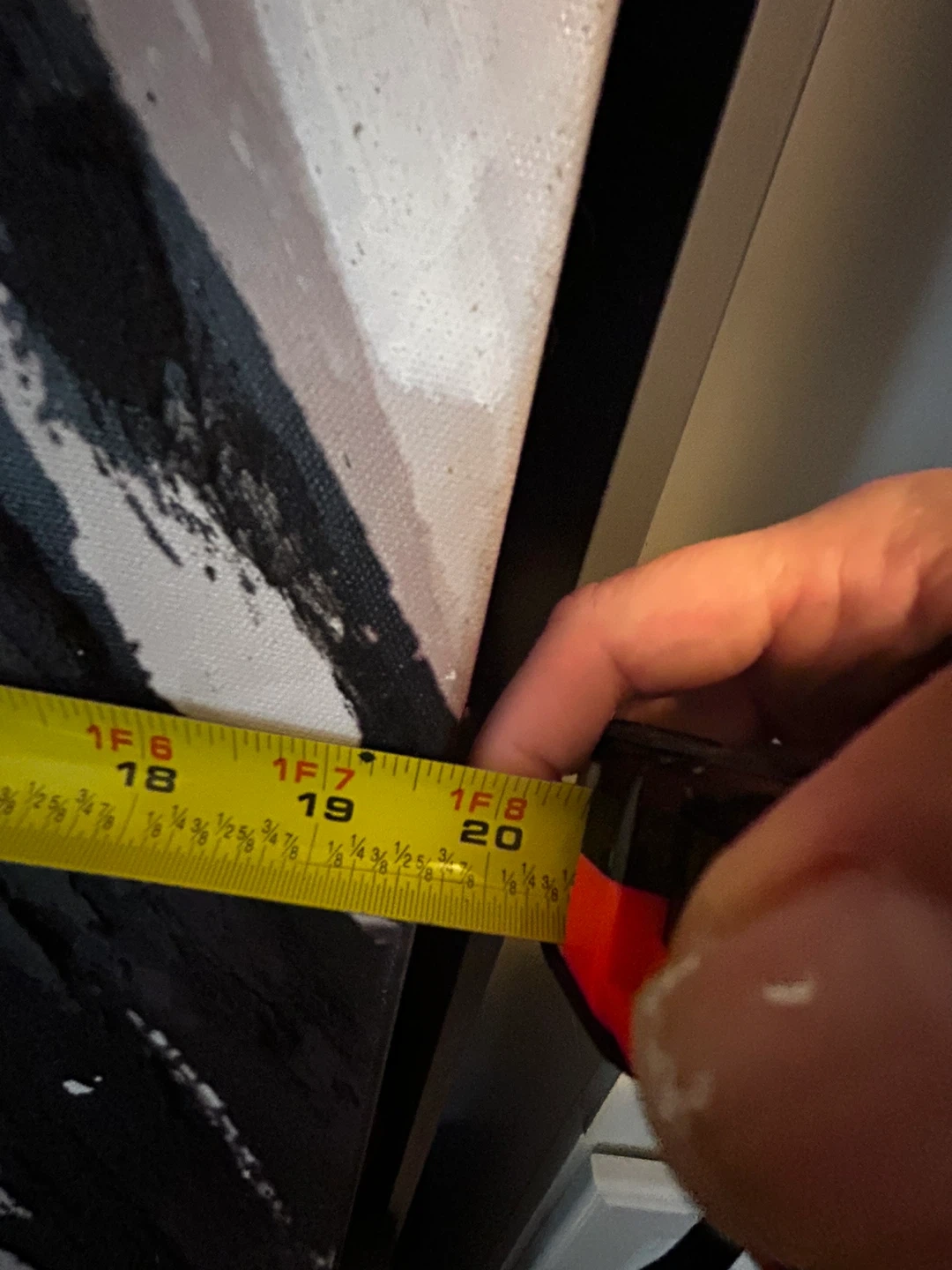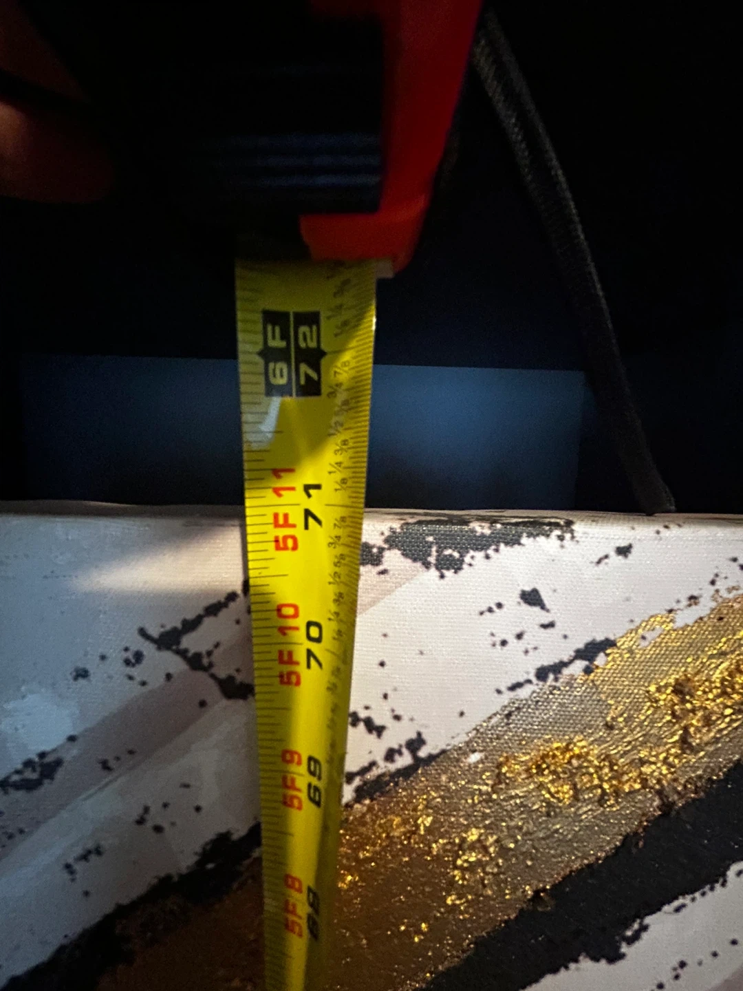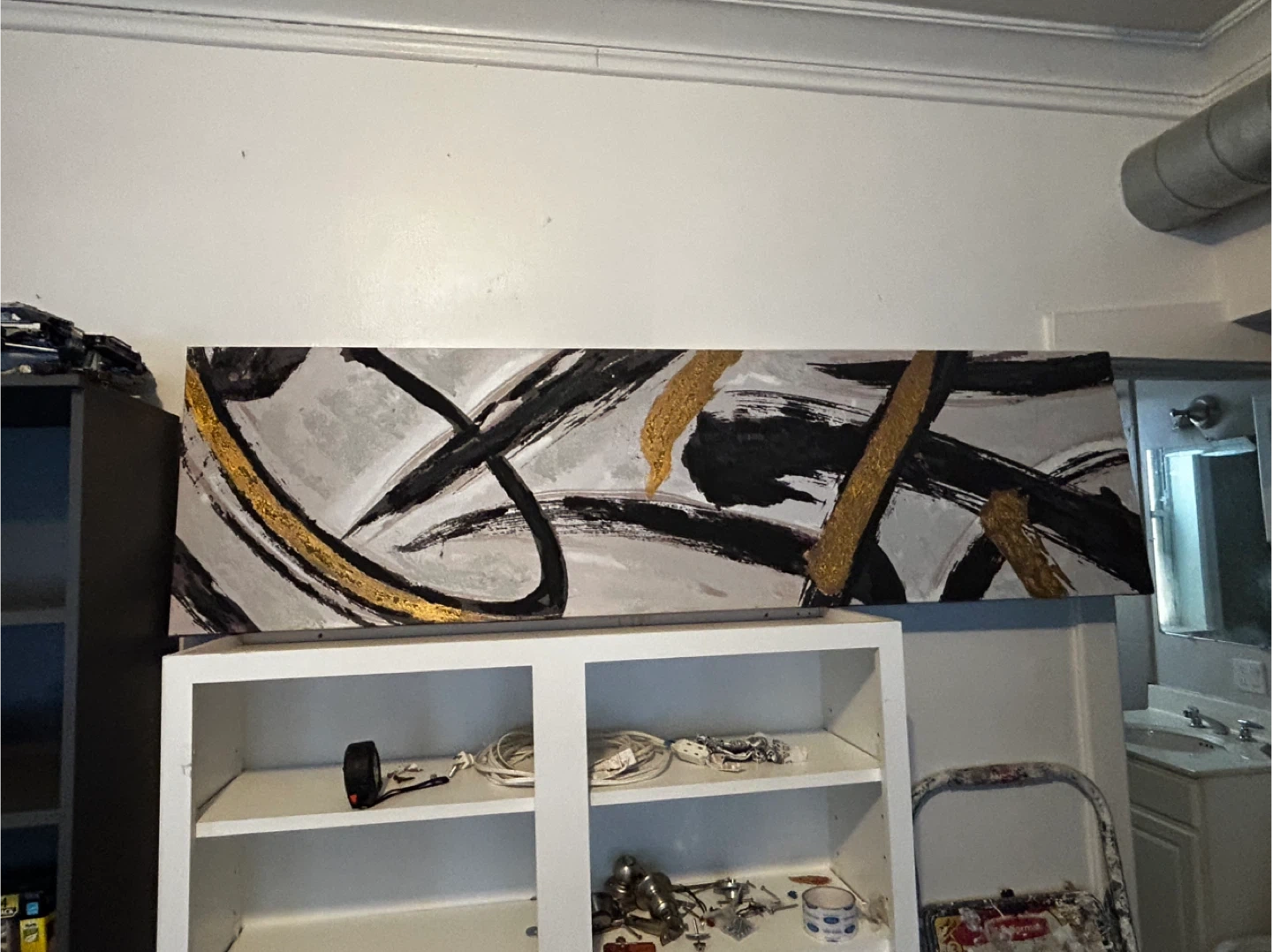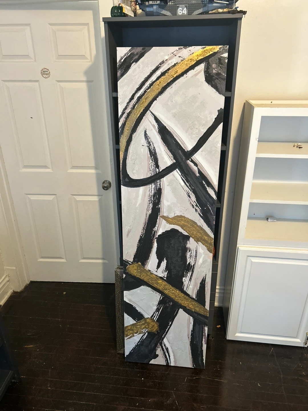 Here's a striking abstract wall art piece featuring bold black, white, and gold accents. It measures approximately 72 inches in length and 20 inches in width. It's a great way to add a touch of modern style to your space!