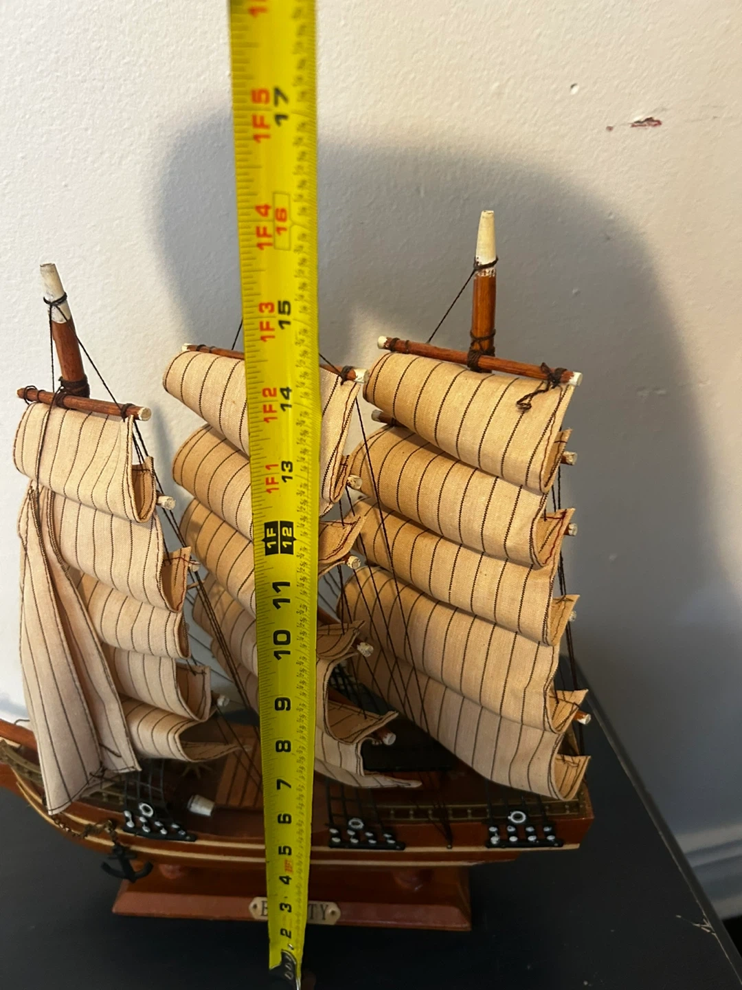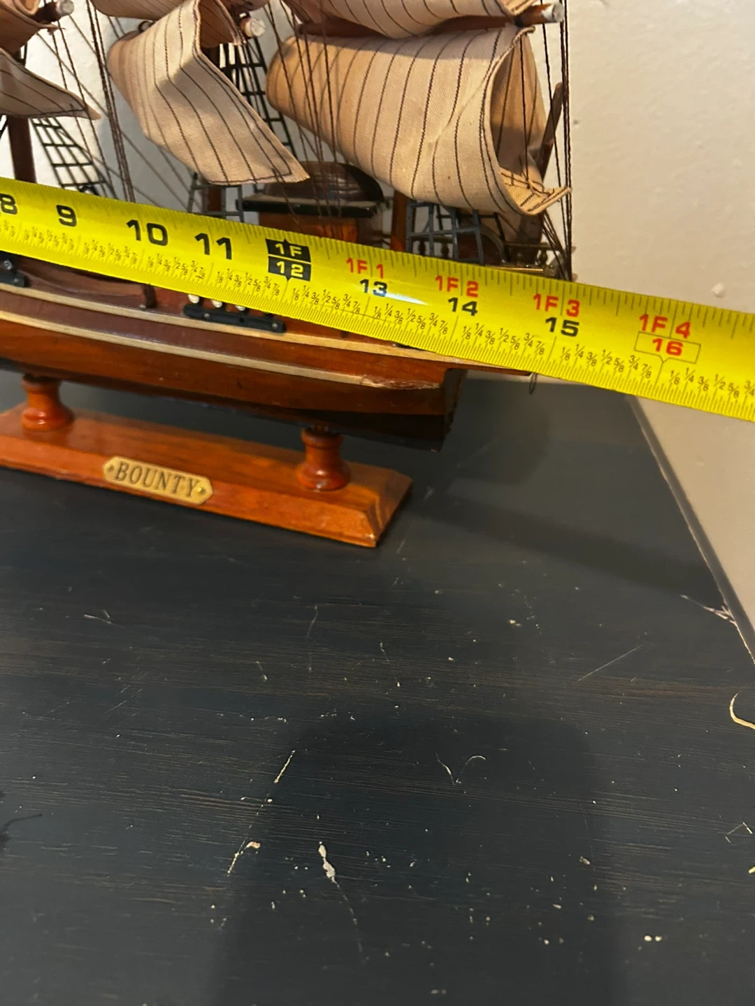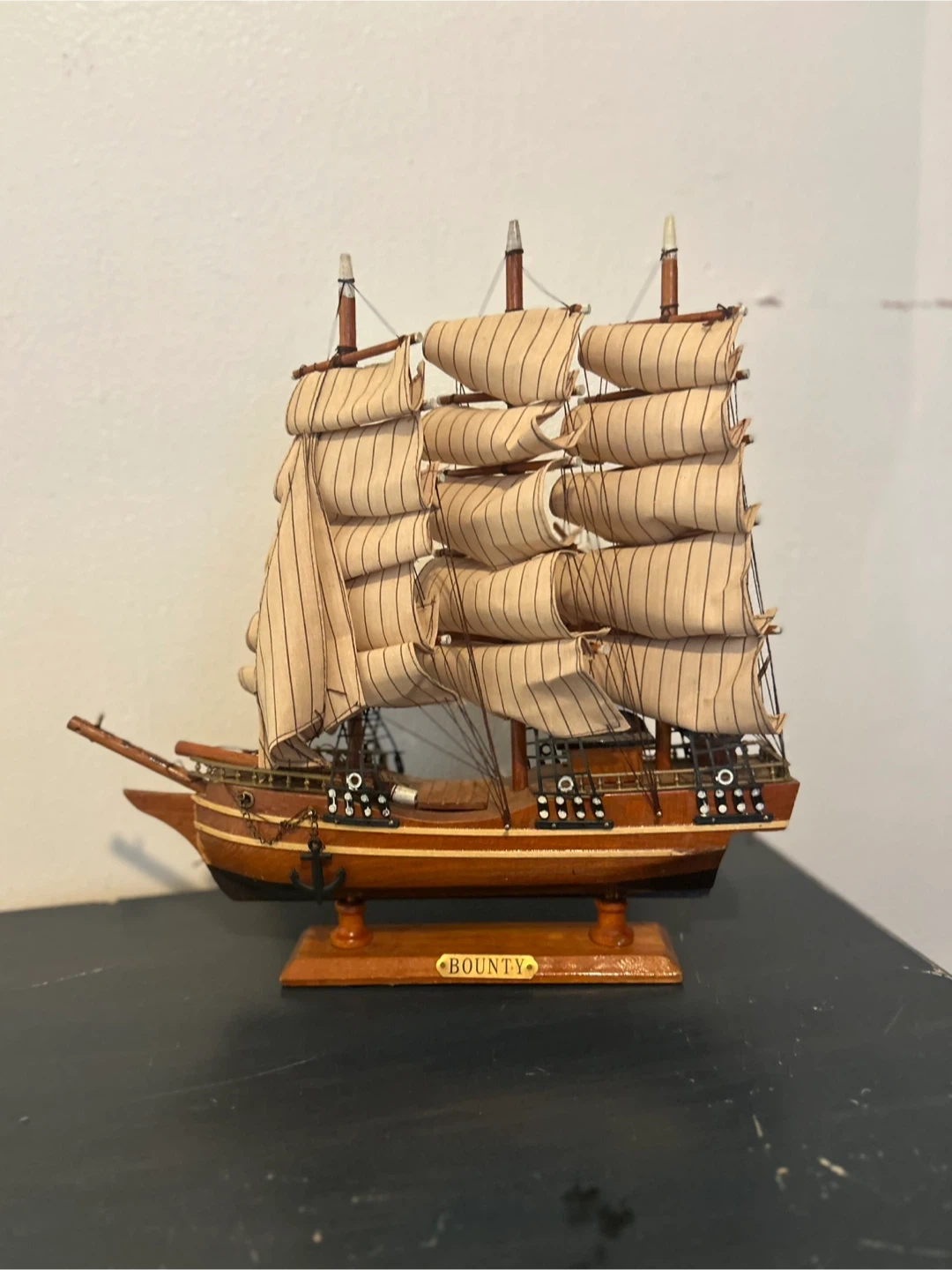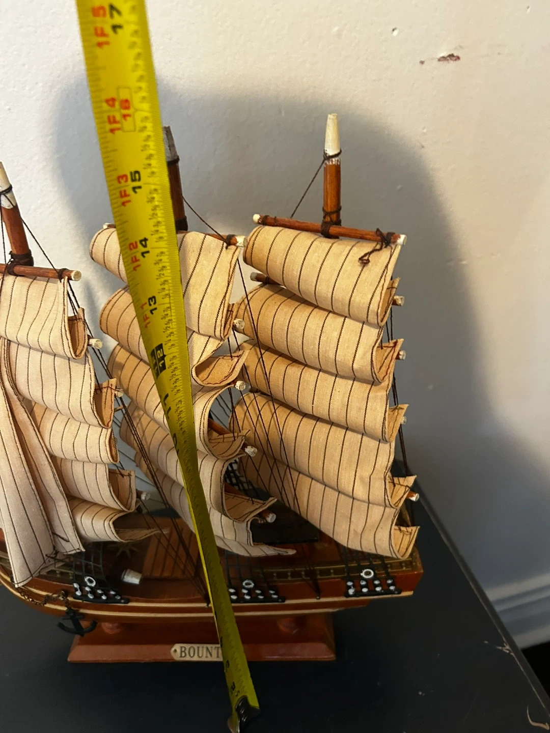 Selling a decorative Bounty ship model. It measures about 17 inches tall and 16 inches long, making it a nice display piece for your home or office