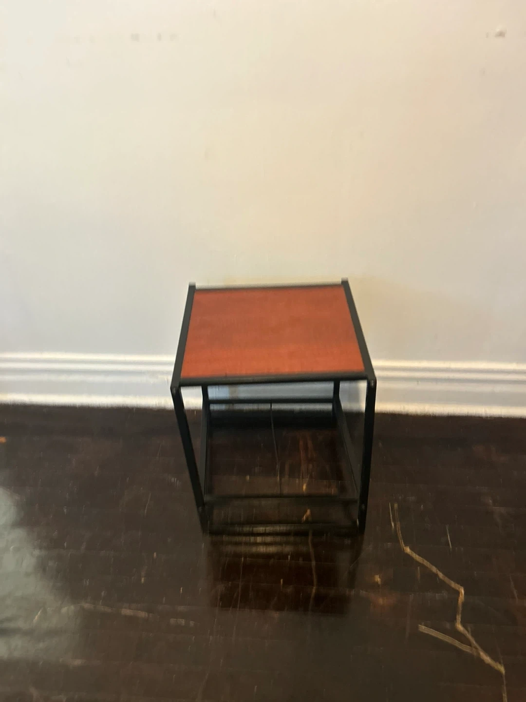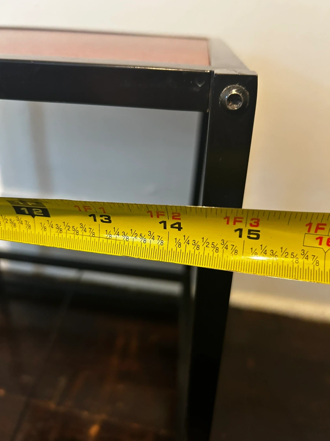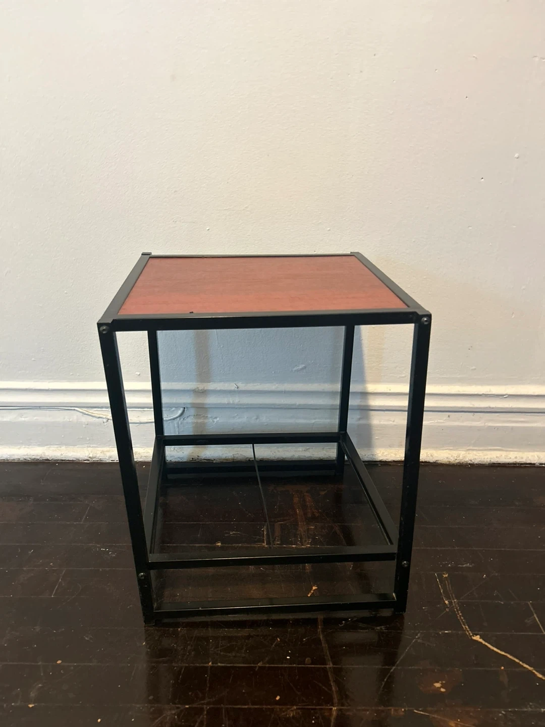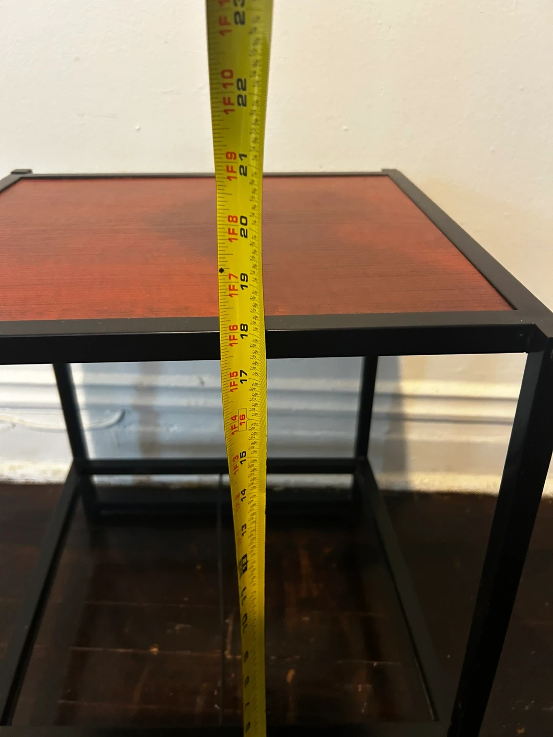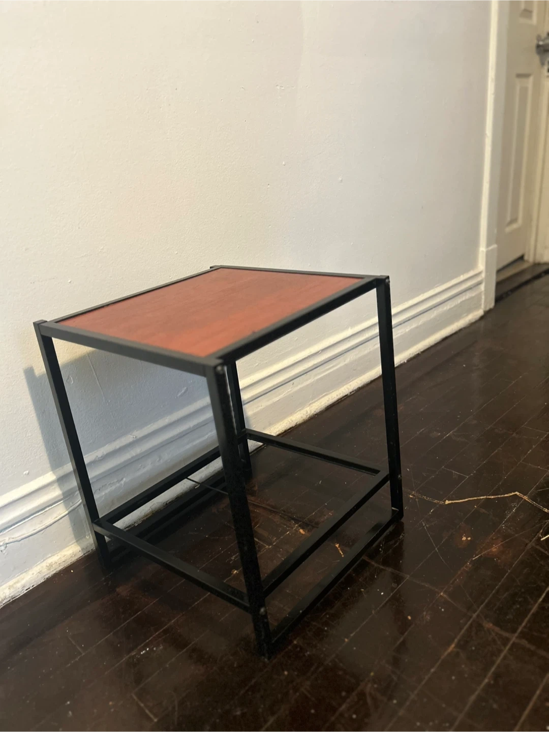 Selling a side table with a black metal frame and a wood-look top. It's about 13 inches wide and 22 inches tall. Perfect for a small space!