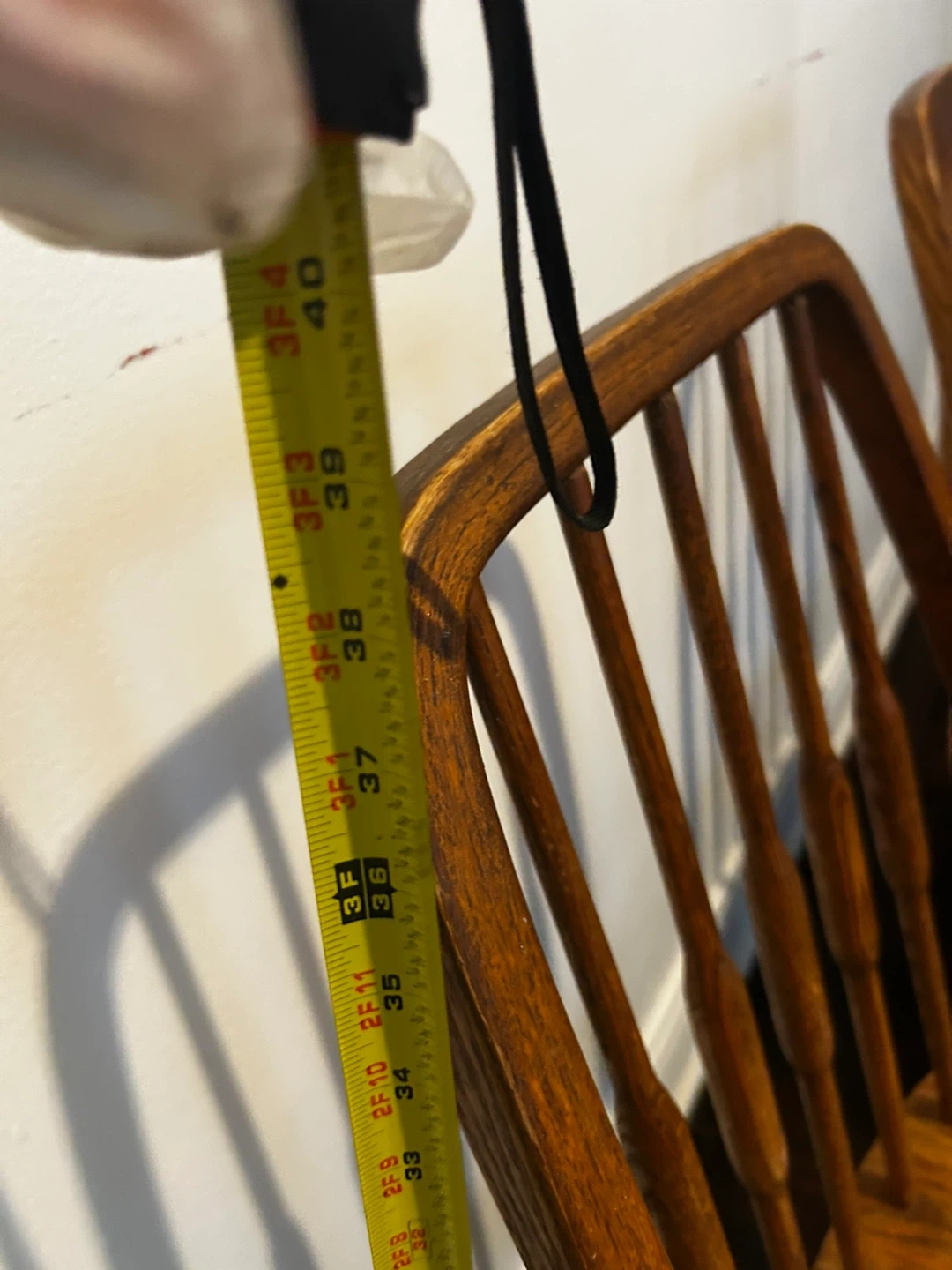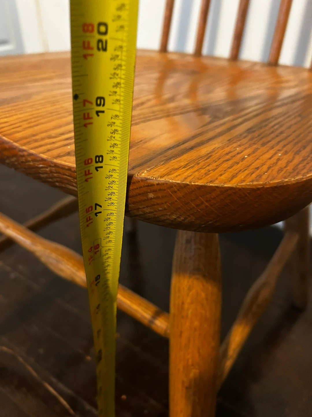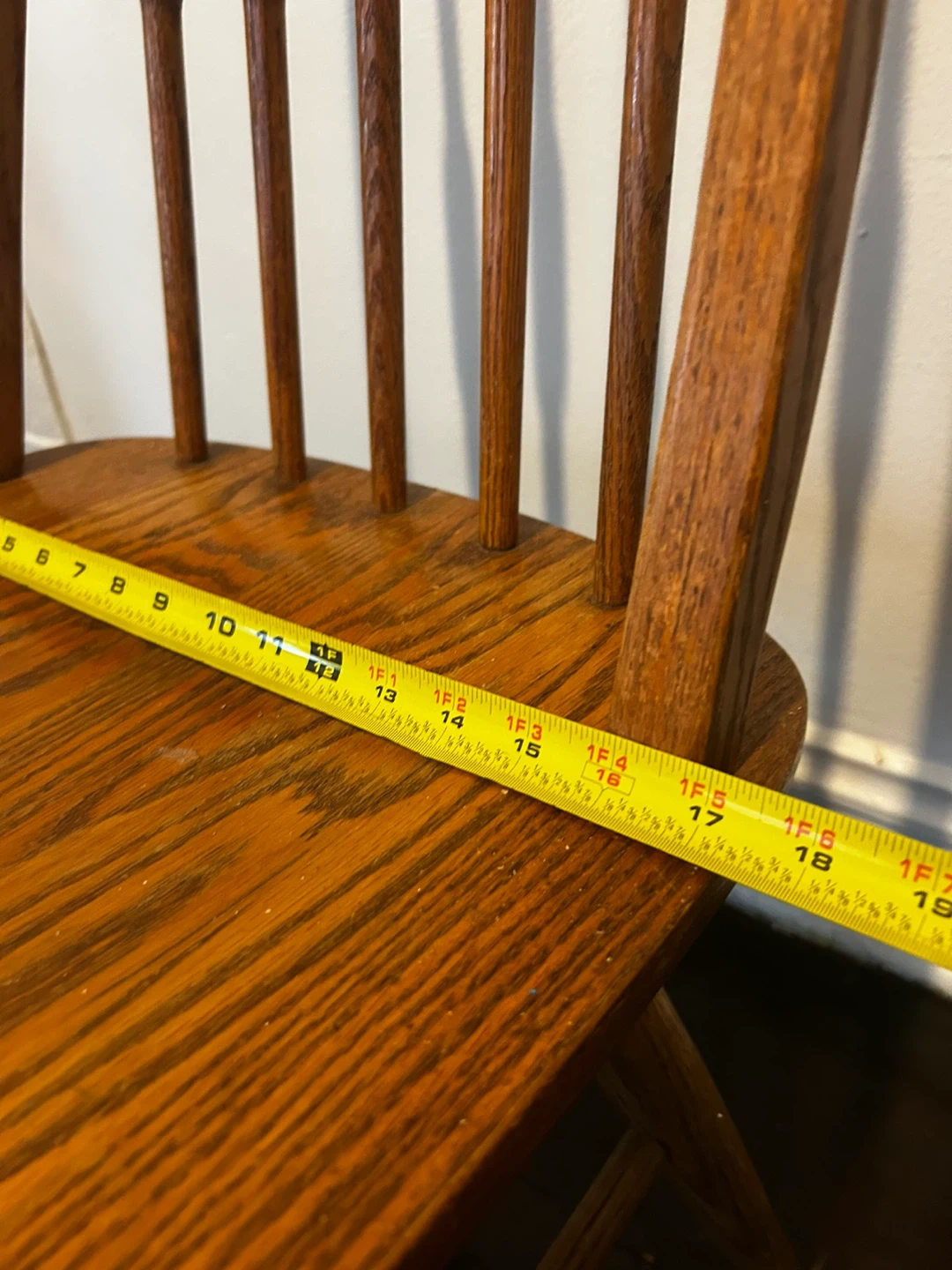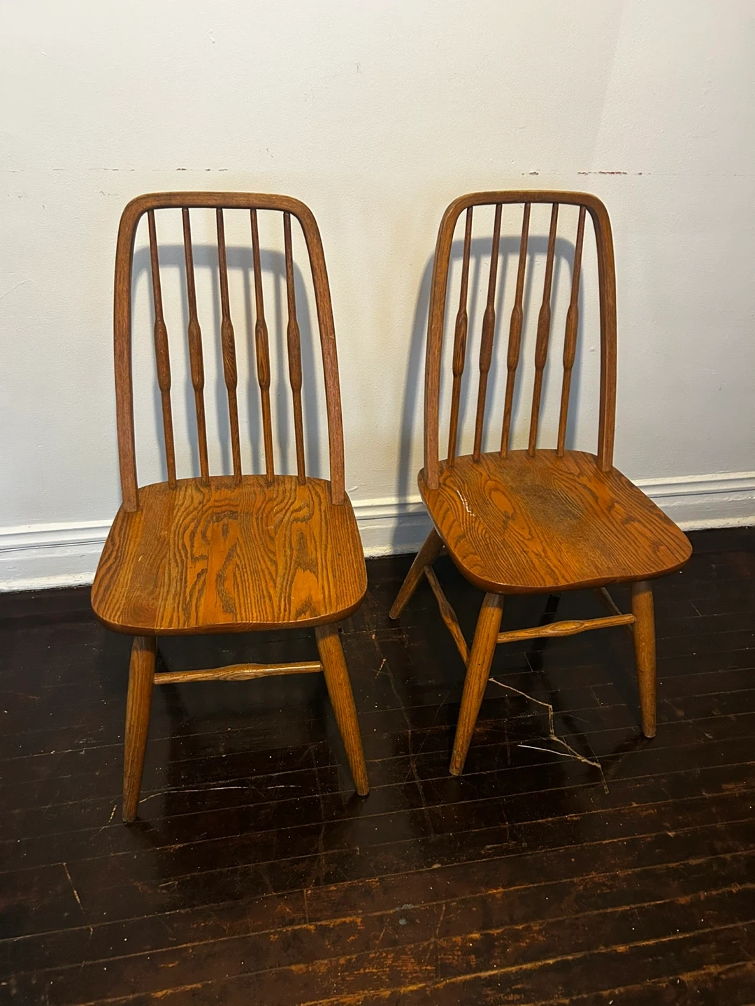 Selling a set of two wooden spindle back dining chairs. They have a warm, natural finish. The seat height is approximately 18 inches, and the total height is about 39 inches. They'd be a great addition to any dining space!