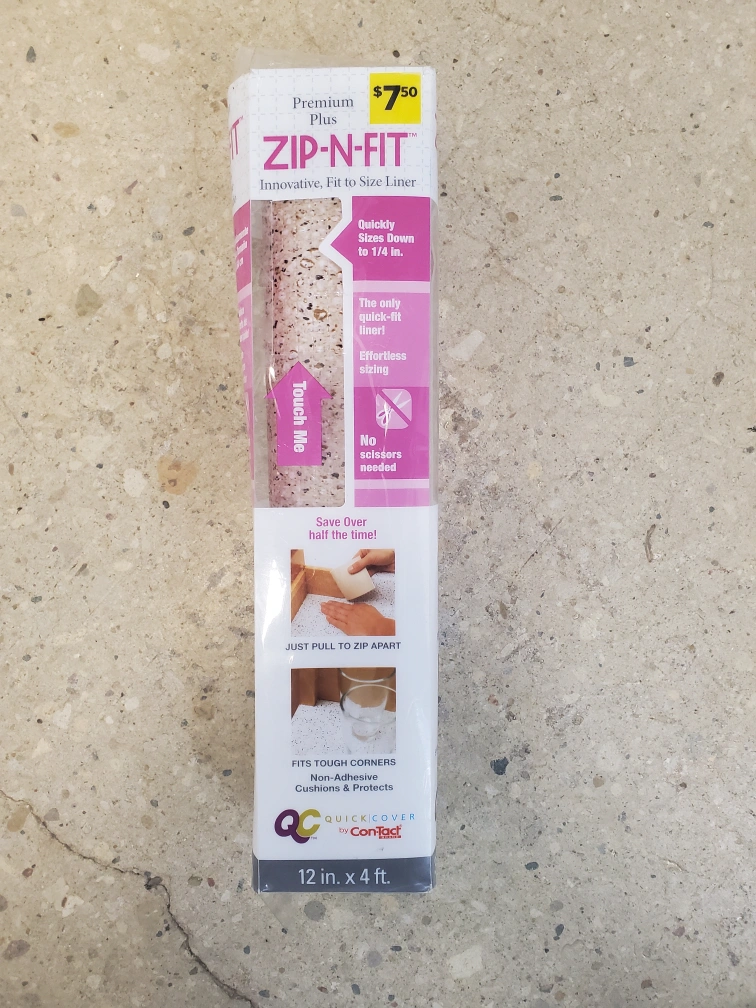 Selling a roll of ZIP-N-FIT Premium Plus shelf liner by QuickCover. It's an innovative, fit-to-size liner. Quickly sizes down to 1/4 in. The only shelf fit liner! Effortless sizing, and no scissors are needed. It's non-adhesive, cushions, and protects. Measures 12 inches x 4 feet. 6 available.