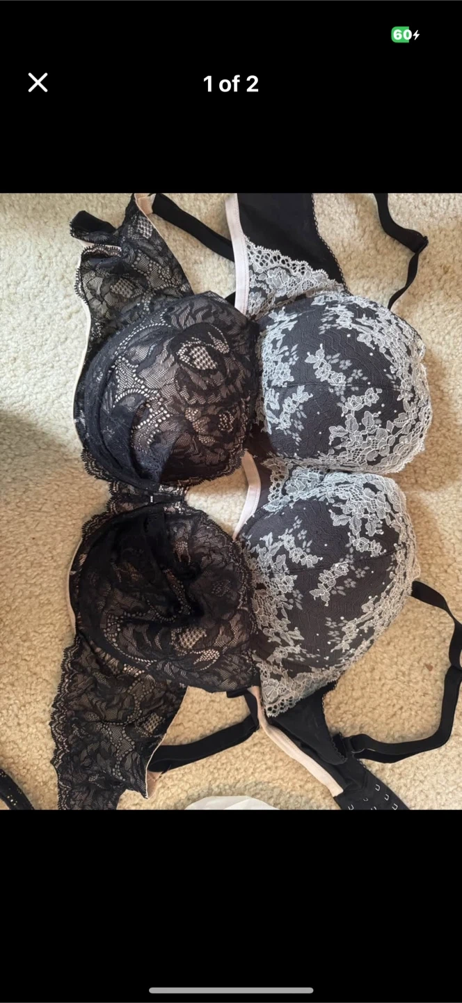 Selling two bras with lace detailing! One is black and the other is gray with white lace. They're in perfect condition and ready for a new home Worn once Size 38 DDD One is fabulous lined One is dream angels lined