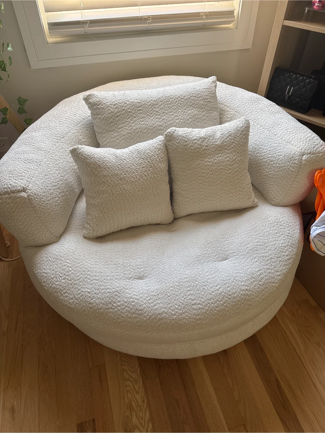 Selling a super comfy, round swivel chair! It's a beautiful white bouclé material and comes with three matching pillows. Perfect for a reading nook or relaxing spot in your living room. The chair is in great condition and ready for a new home!