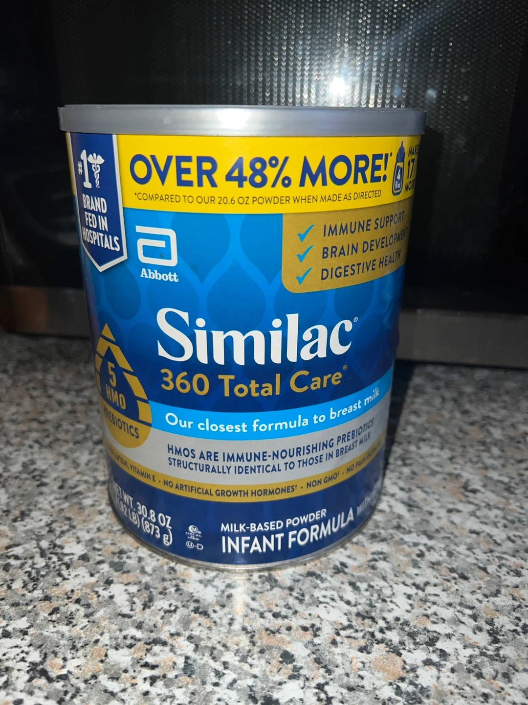 Selling a can of Similac 360 Total Care infant formula. It contains 5 HMO prebiotics for immune support, brain development, and digestive health. It's milk-based powder and contains no artificial growth hormones