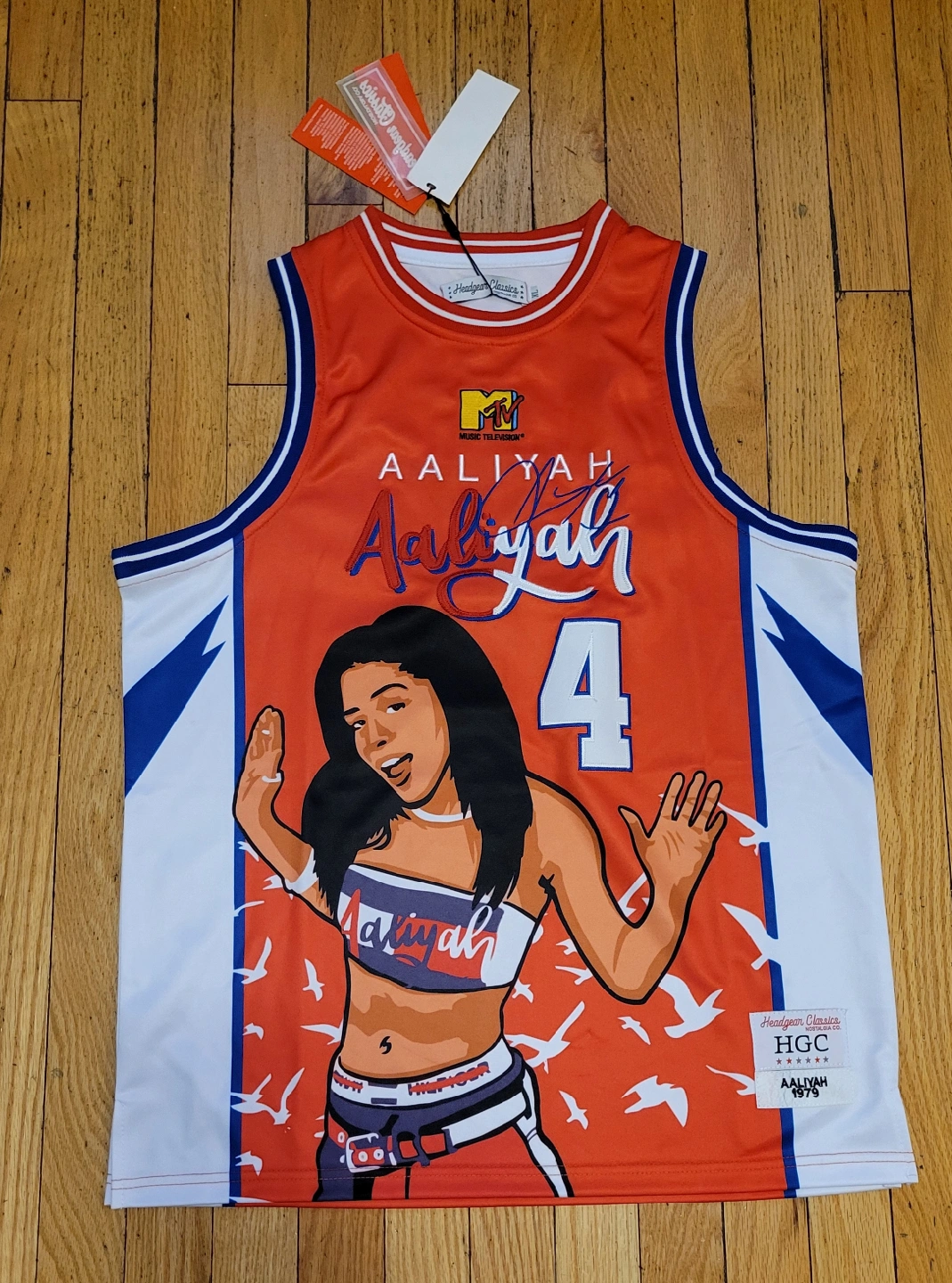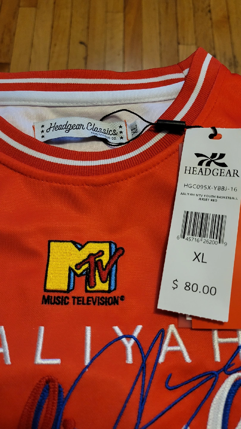 511I'm selling a brand new Aaliyah MTV basketball jersey! It's a size XL and still has the tags on it. The jersey is red with white and blue accents, featuring the MTV logo and an image of Aaliyah. Originally bought for $80 XL in kids or small adults