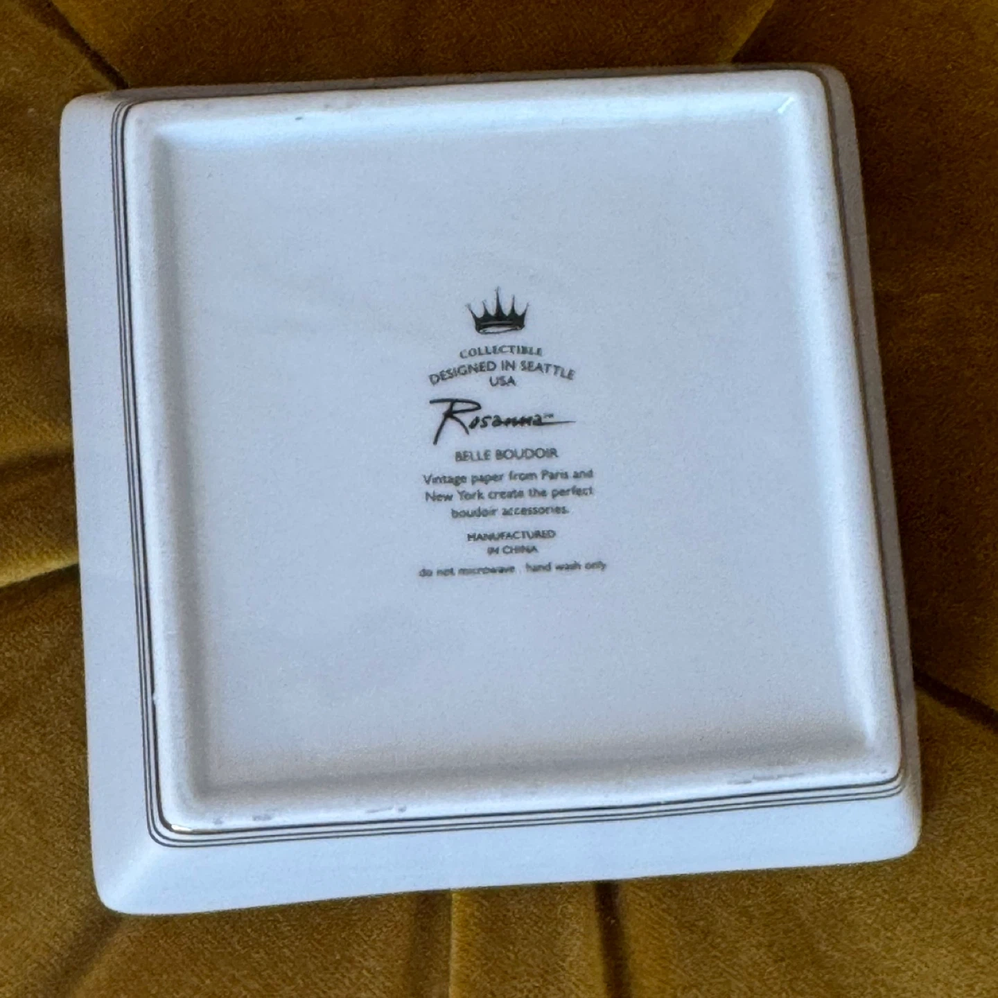This is a beautiful Rosanna trinket dish, designed in Seattle. It features a Paris Ritz Hotel design in gold. It's perfect for holding jewelry or other small items. Hand wash only