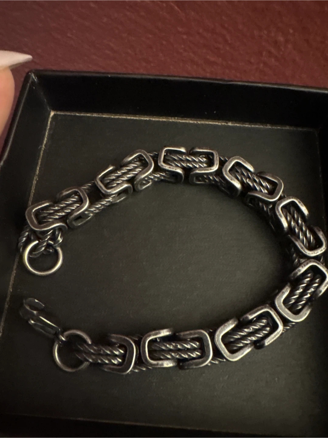 Selling a Black Stainless Steel bracelet. It has a unique design with a lobster claw clasp comes with box or velvet pouch New