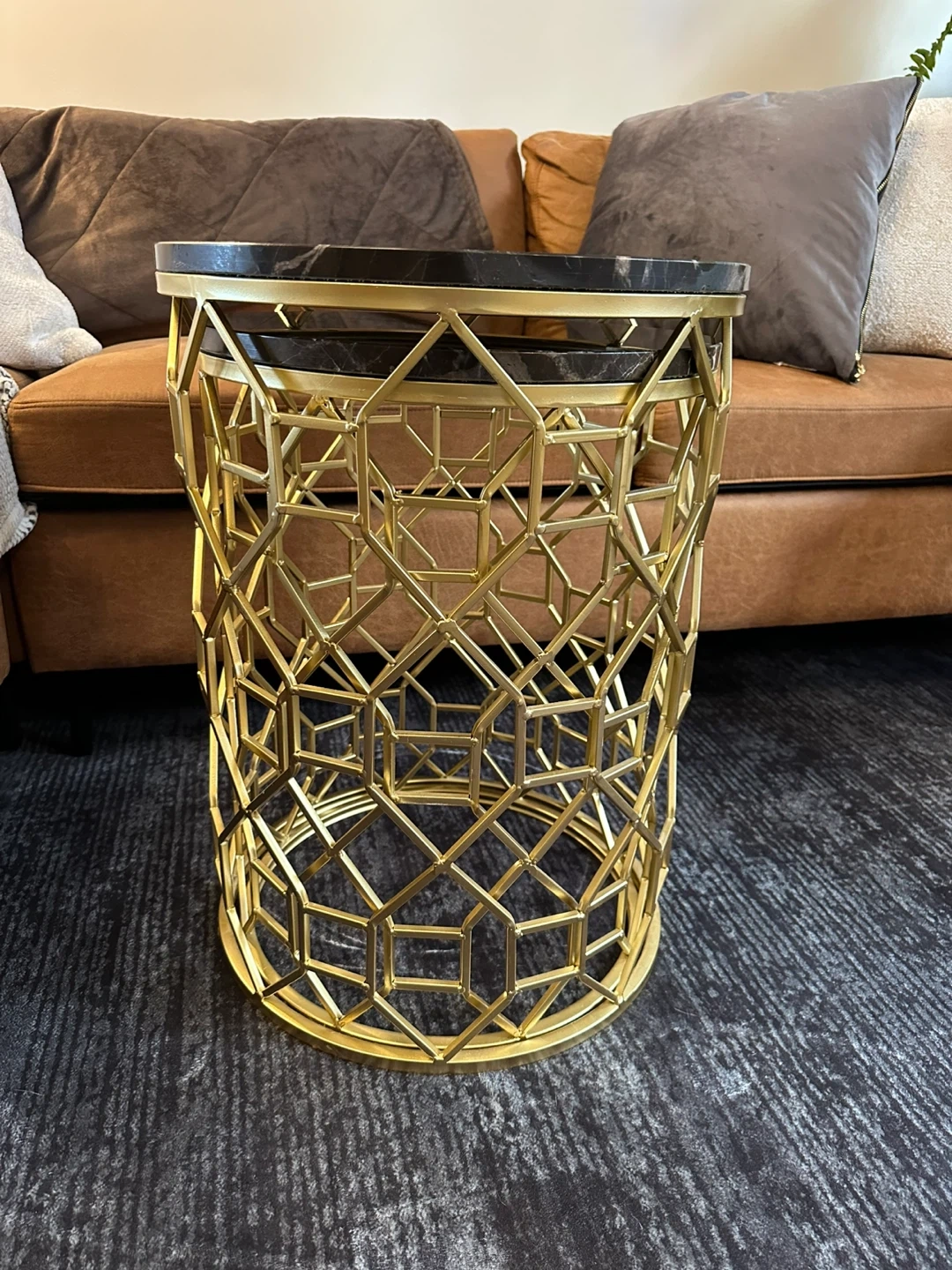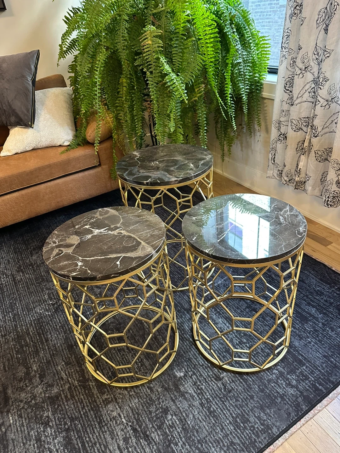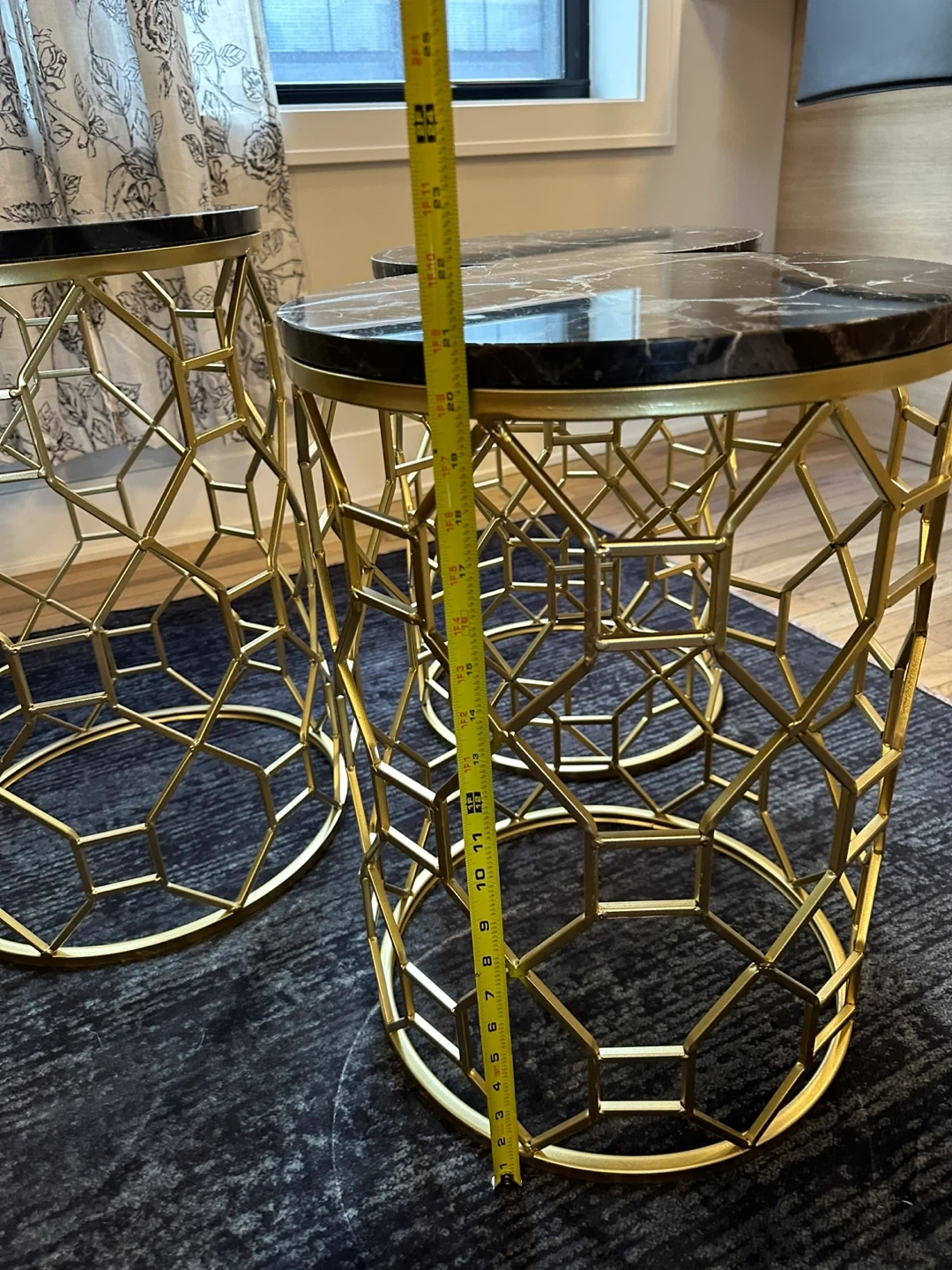 Selling a set of three side tables with marble tops and gold geometric bases! Less than 2 years old, from Home Goods. (3rd one is sold)