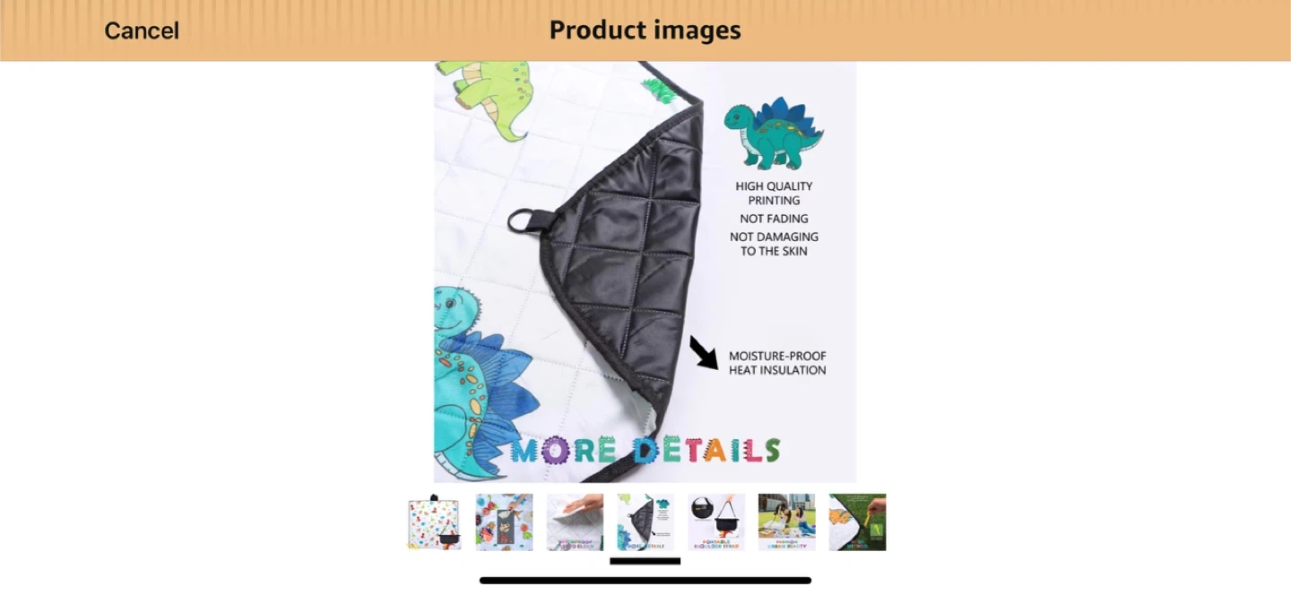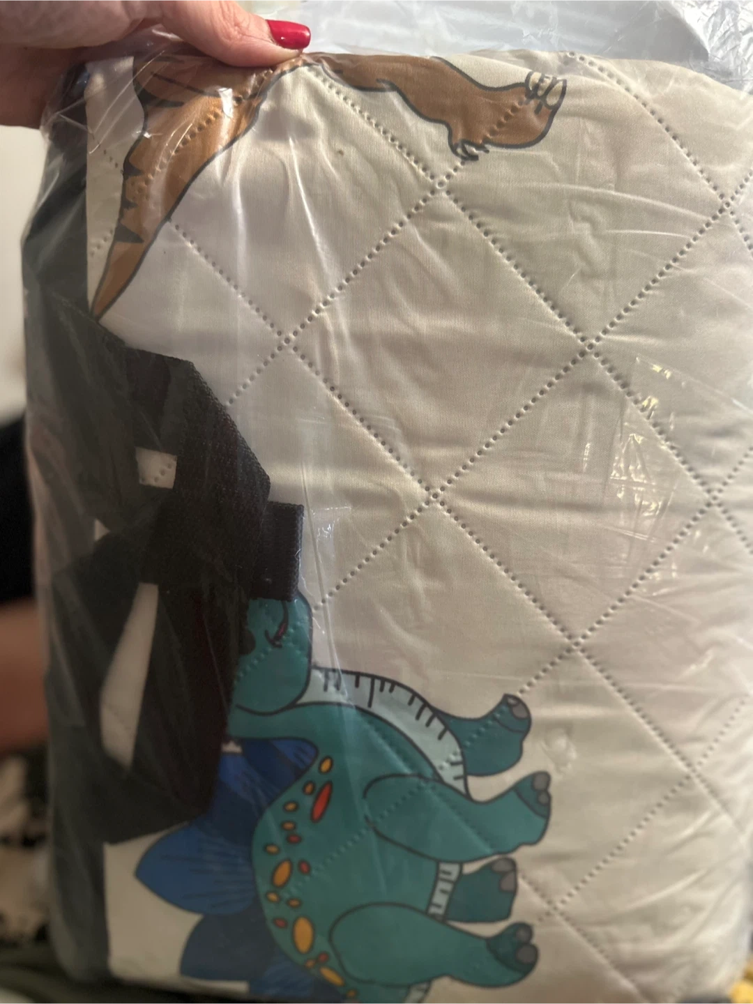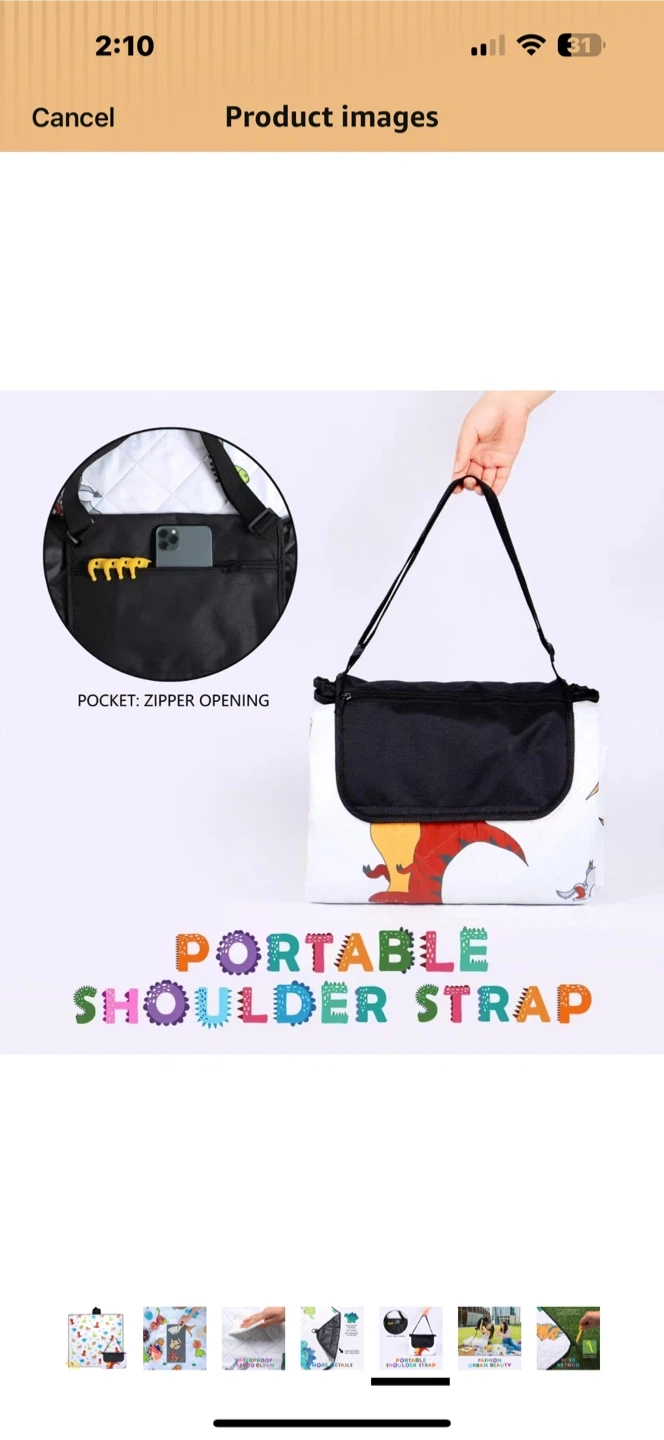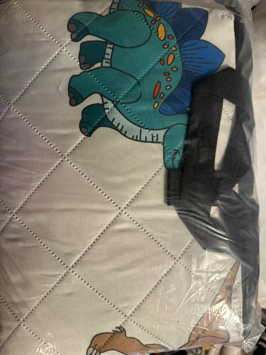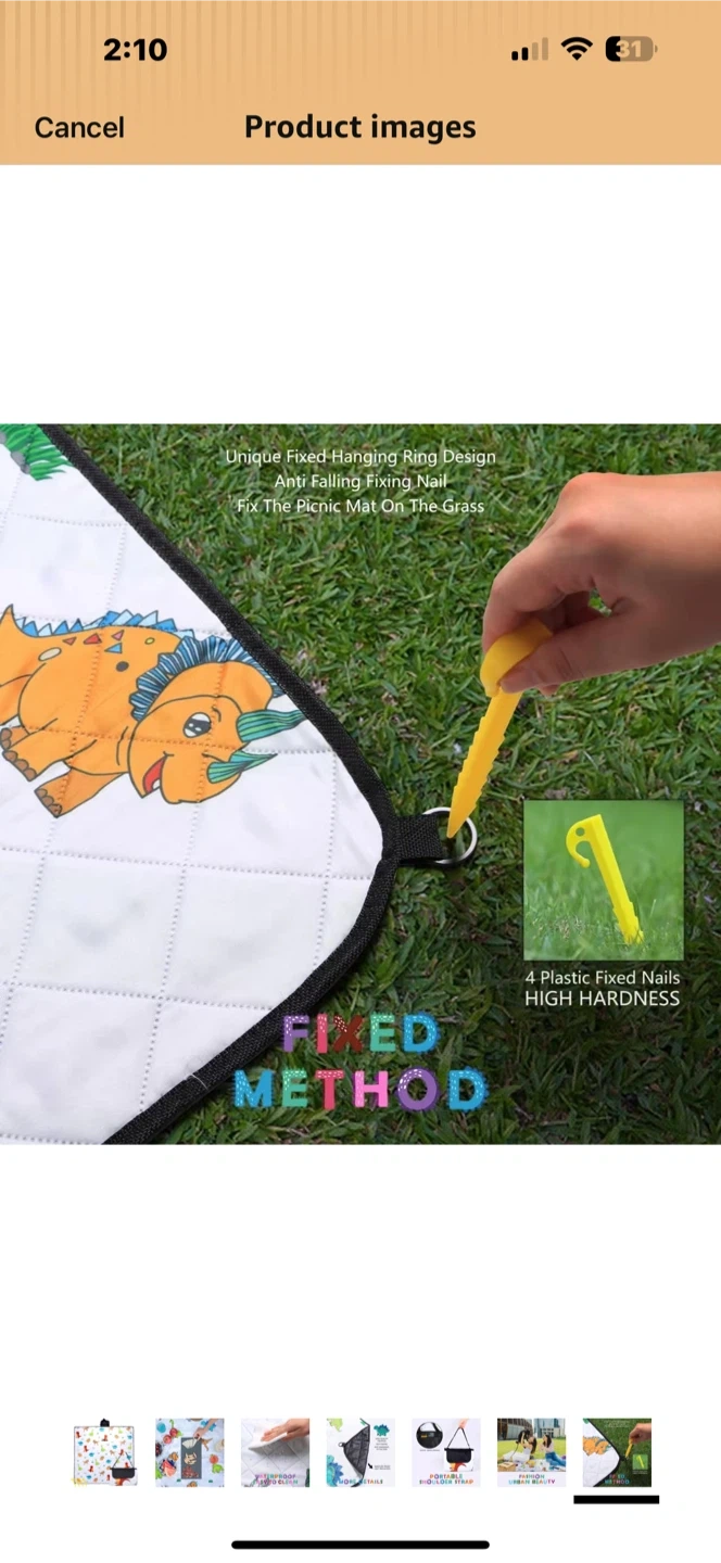 This is a cute picnic blanket with a dinosaur print. It has a unique fixed-hanging ring design and comes with anti-falling fixing nails to fix the picnic mat on the grass. The blanket is made with high-quality printing that is not fading and not damaging to the skin