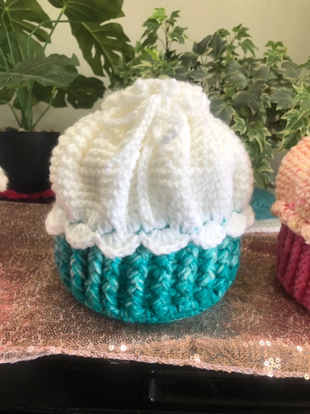 60This is a cute, handmade crocheted cupcake makeup bag. It's white and turquoise, and in new. It would be a sweet addition to any room! Can store your hair accessories