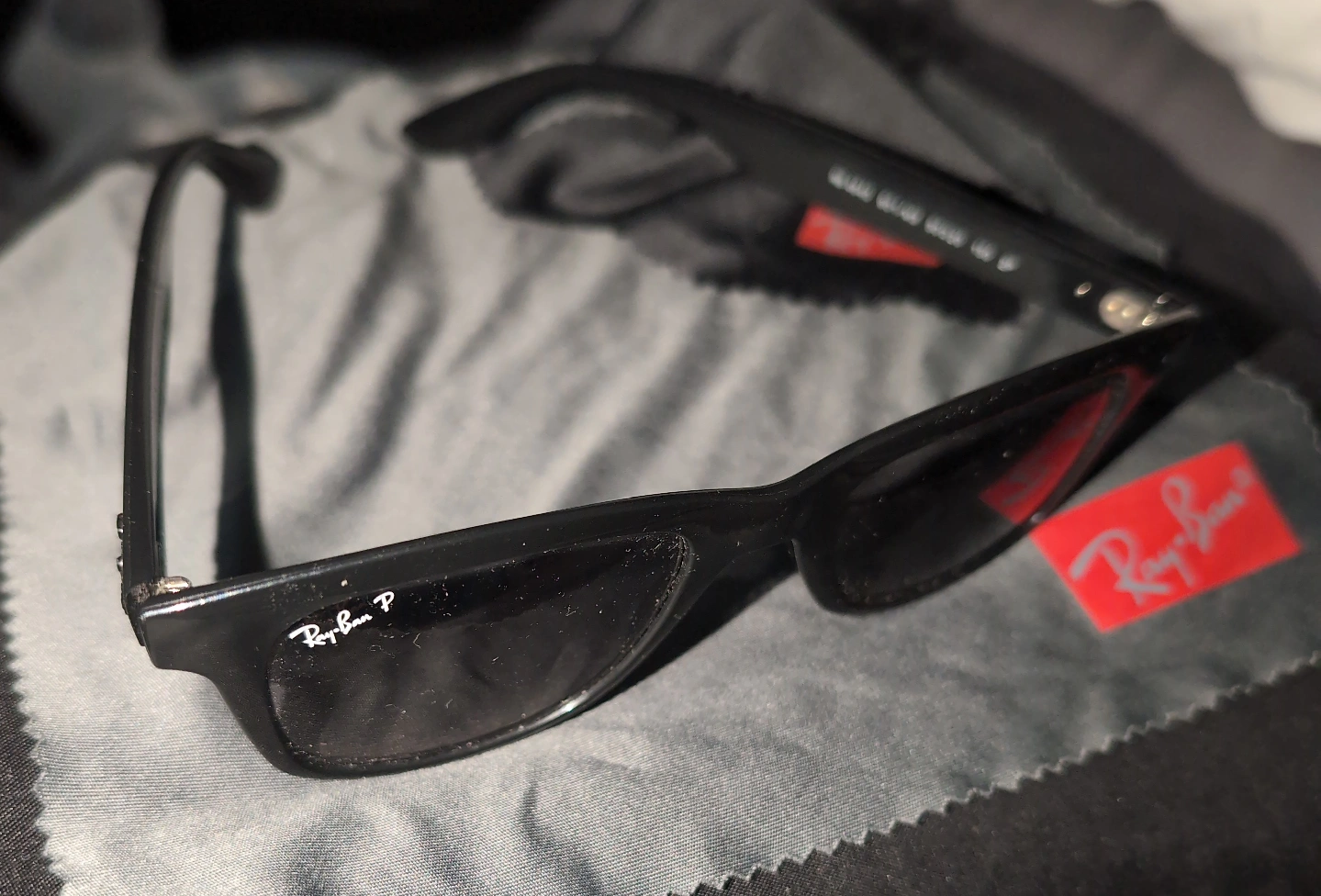 Selling a pair of Ray-Ban sunglasses in black. They come with a case and a cleaning cloth. They are in good condition!