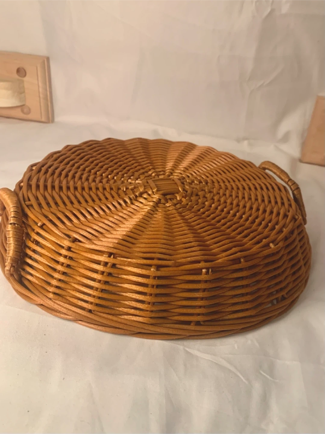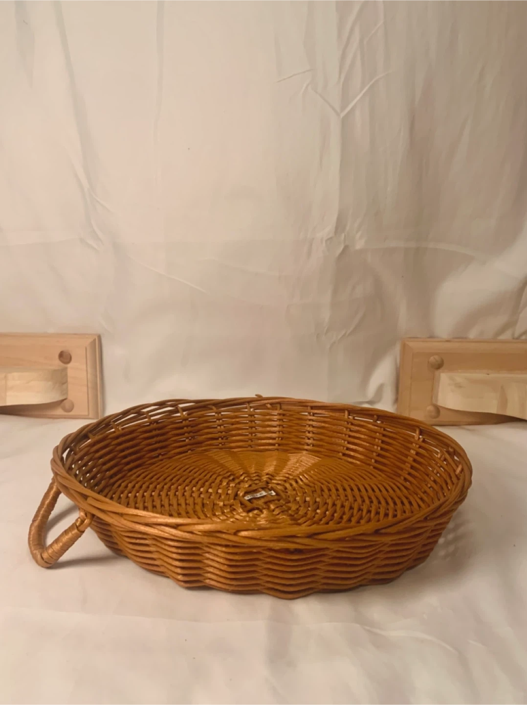Bring a touch of natural charm to your space with this beautifully handwoven wicker basket. Crafted with sturdy, flexible weave and dual pivoting handles that lay flat when not in use, this piece is as functional as it is stylish. Features: • Handwoven wicker in warm honey tone • Pivoting handles fold down for easy stacking or display • Diameter: ~11 inches (28 cm) • Height: ~3 inches • Great for fruit, bread, decorative arrangements, or storage Condition: Excellent vintage condition with minimal wear. Perfect for farmhouse, cottagecore, or minimalist interiors — this basket brings cozy, organic texture to any setting. 🌿