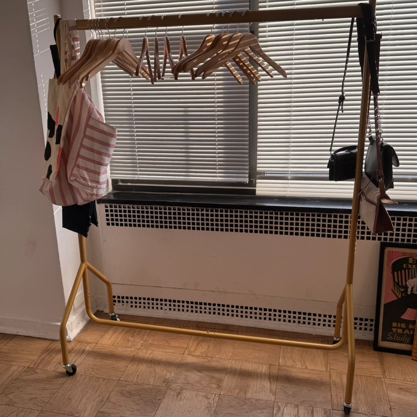 Selling a gold-colored clothing rack on wheels. Retails for $70. It's in excellent condition and ready to hold your clothes! Perfect for adding extra storage to your room or closet, or for your foyer to welcome guests. It takes a load of up to 420 lbs. Hangers and such are not included, but they give you a sense of how large it is and how much will fit! The wheels can lock.