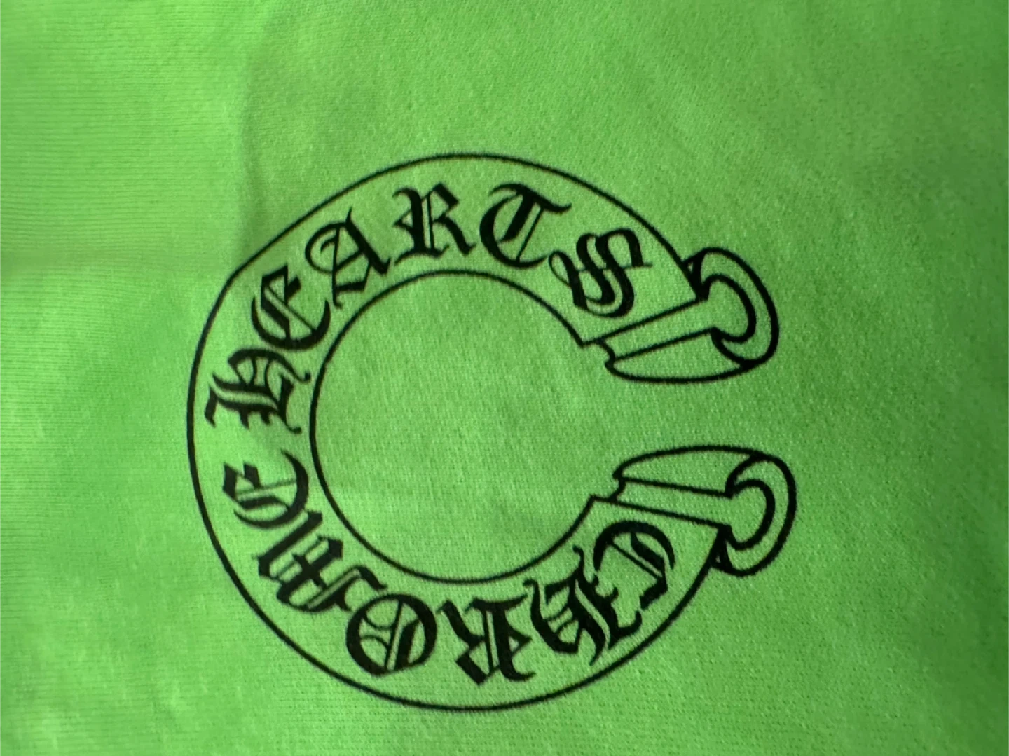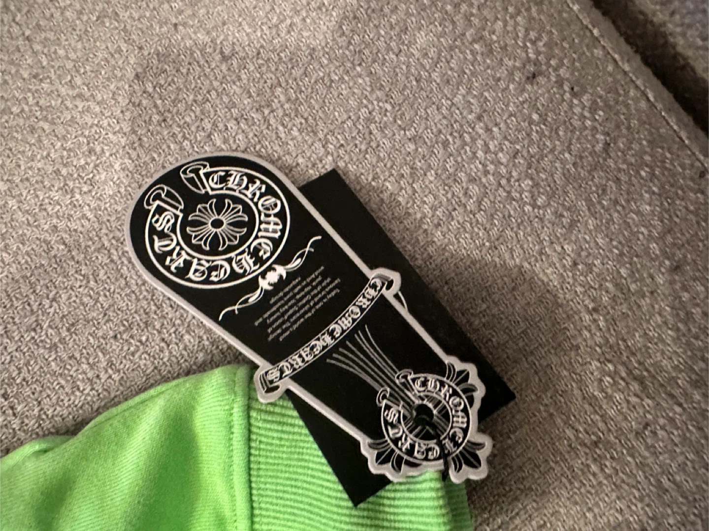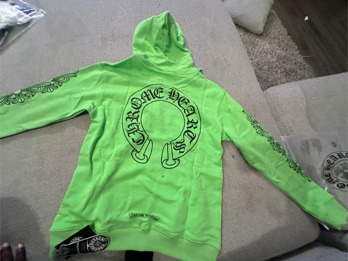 20Selling a Chrome Hearts hoodie in a vibrant green color! It features the signature Chrome Hearts cross design on the sleeves and back. The hoodie is in great condition and ready for a new home